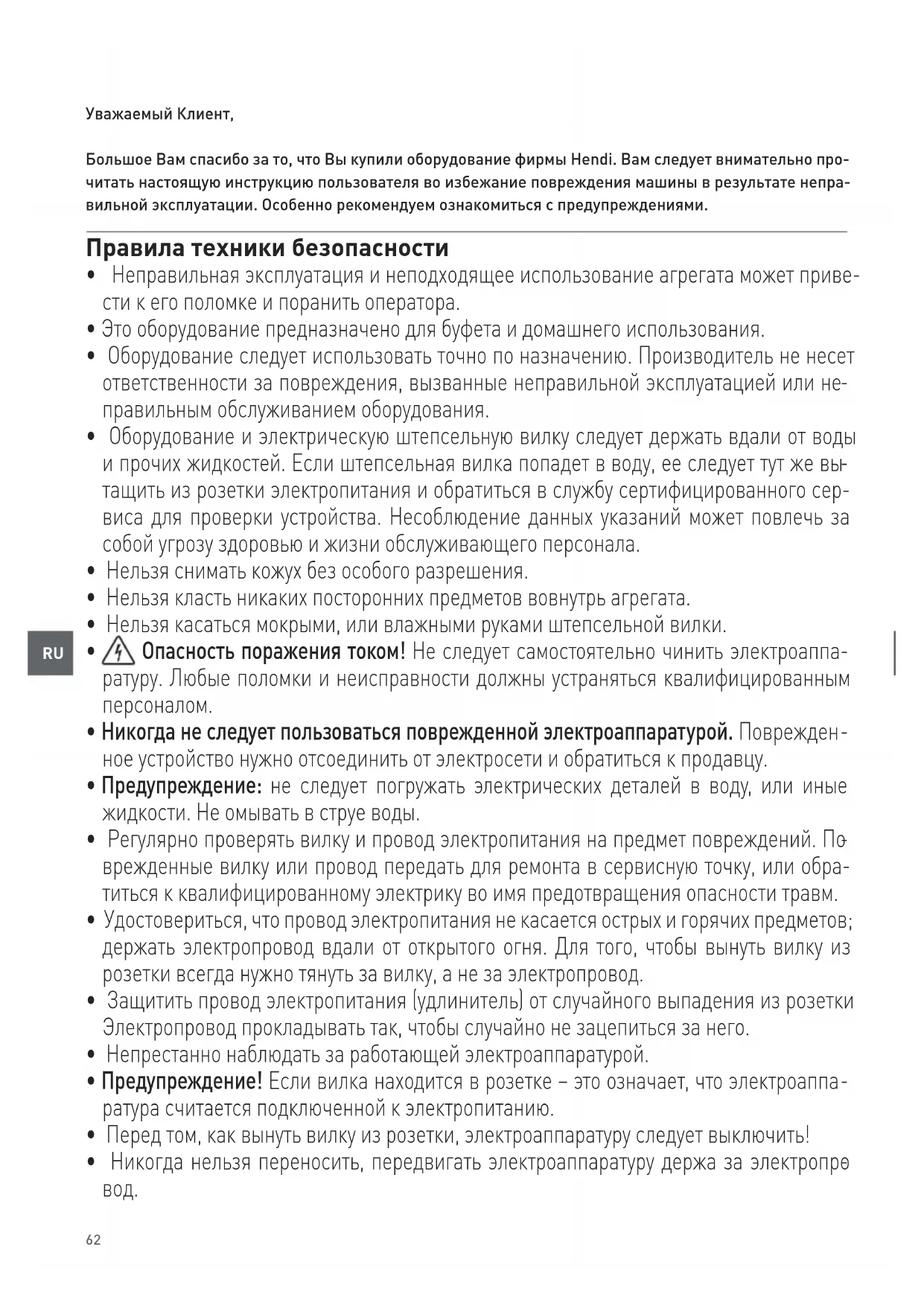 Уважаемый Клиент, Большое Вам спасибо за то, что Вы купили оборудование фирмы Hendi. Вам следует внимательно про- читать настоящую инструкцию пользователя во избежание повреждения машины в результате непра- вильной эксплуатации. Особенно рекомендуем ознакомиться с предупреждениями. Правила техники безопасности