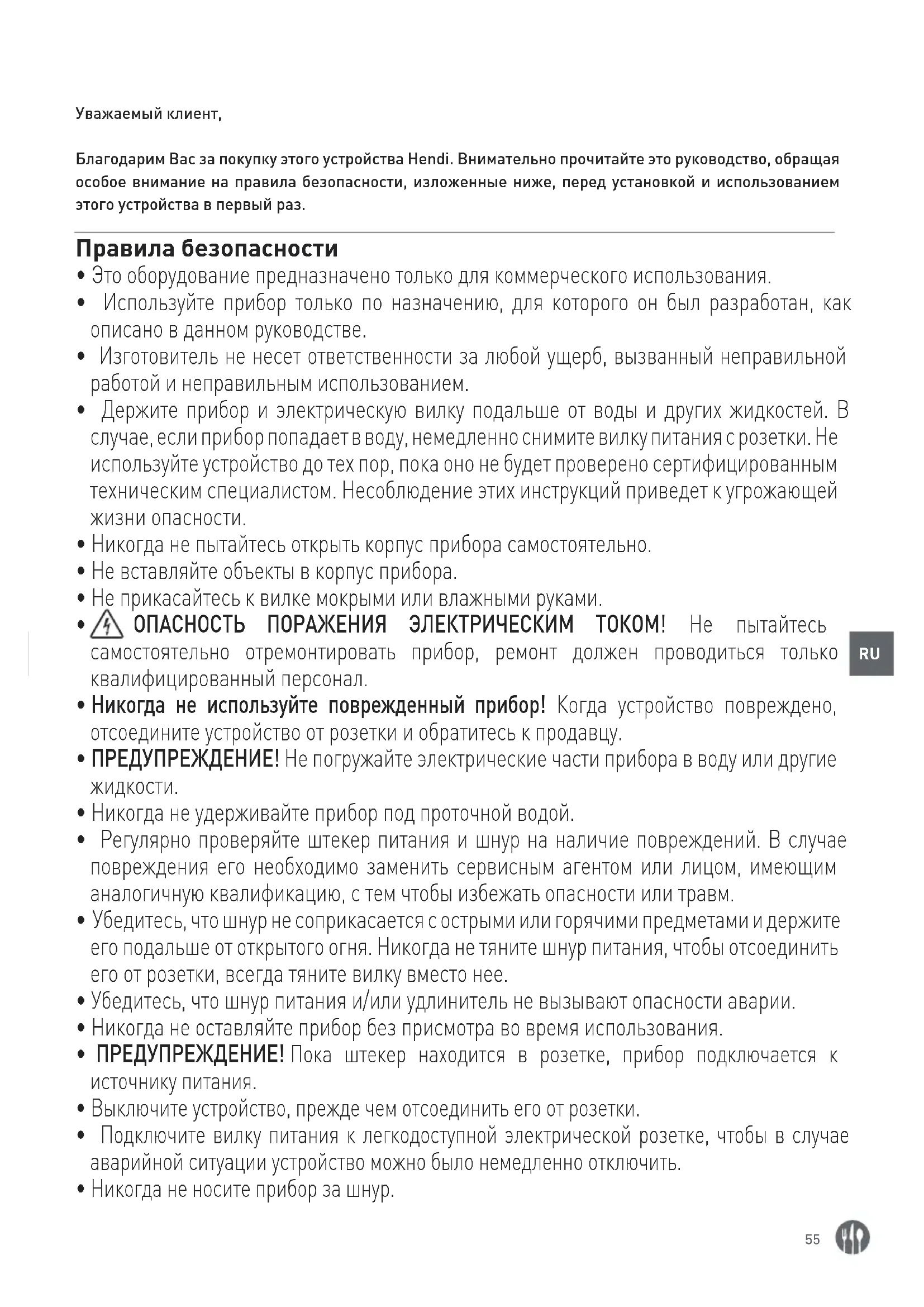 Уважаемый клиент, Благодарим Вас за покупку этого устройства Hendi. Внимательно прочитайте это руководство, обращая особое внимание на правила безопасности, изложенные ниже, перед установкой и использованием этого устройства в первый раз. Правила безопасности