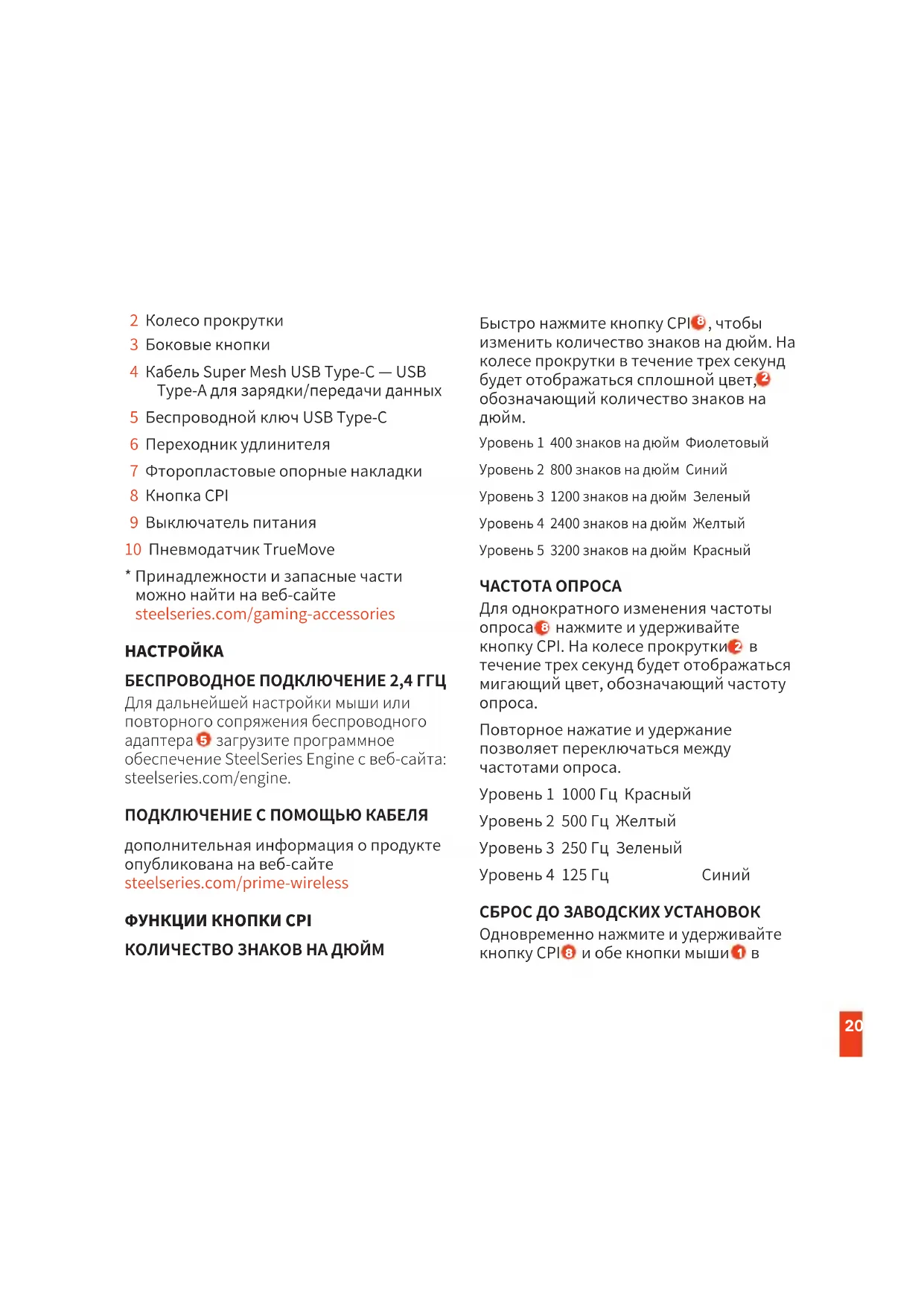 загрузите программное обеспечение SteelSeries Engine с веб-сайта: steelseries.com/engine. ПОДКЛЮЧЕНИЕ С ПОМОЩЬЮ КАБЕЛЯ дополнительная информация о продукте опубликована на веб-сайте steelseries.com/prime-wireless ФУНКЦИИ КНОПКИ CPI КОЛИЧЕСТВО ЗНАКОВ НА ДЮЙМ Быстро нажмите кнопку CPI