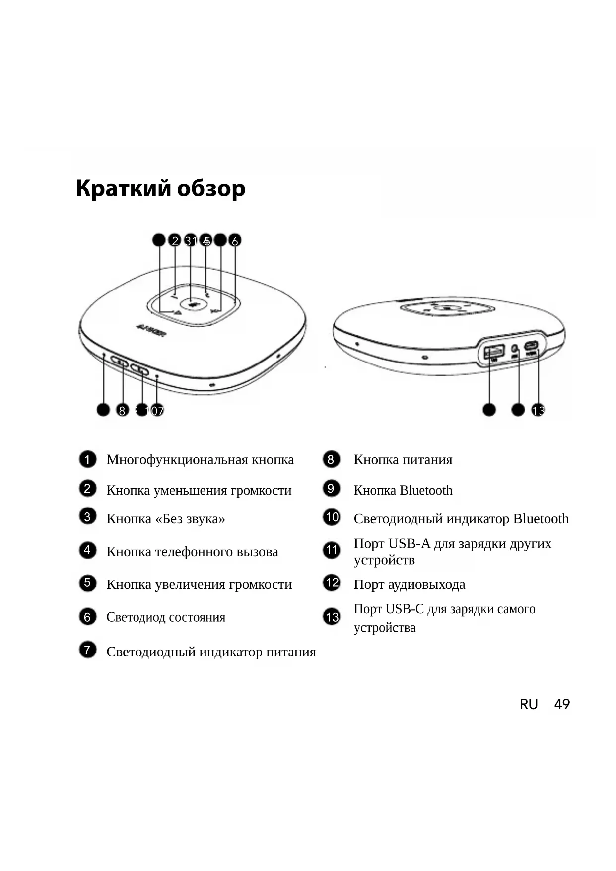 Светодиодный индикатор питания50 RU Подключение а) Подключите к компьютеру с помощью кабеля USB. б) Подключите к компьютеру или мобильному устройству с помощью сопряжения Bluetooth. При первом включении устройства оно автоматически перейдет в режим сопряжения Bluetooth. Anker PowerConfRU 51 Одно нажатие Переход в режим сопряжения Мигает синим Выполняется сопряжение Bluetooth Горит синим светом Bluetooth подключен