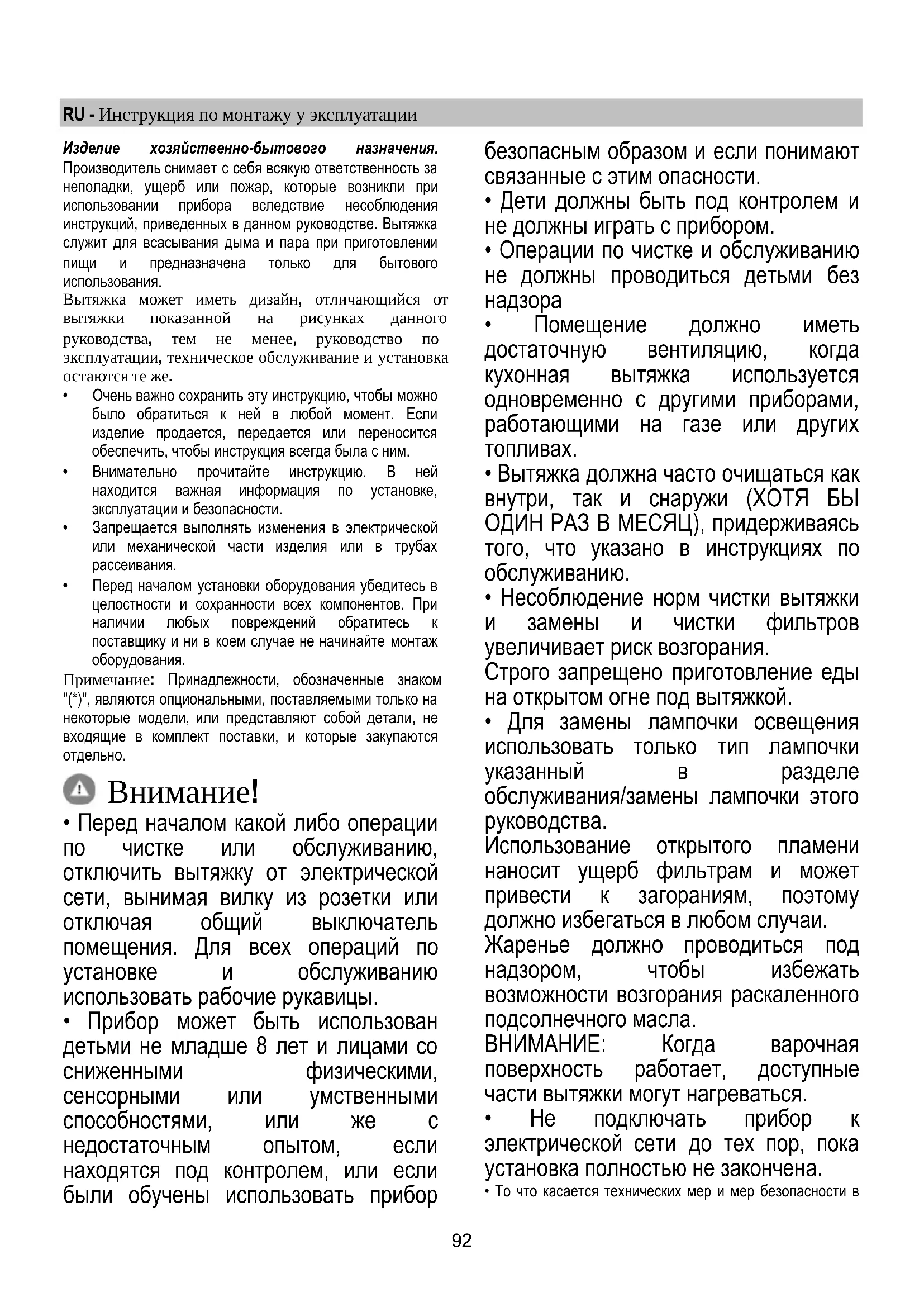 - Вытяжка НИКОГДА не должна использоваться, как опорная поверхность, если только не указано иначе.