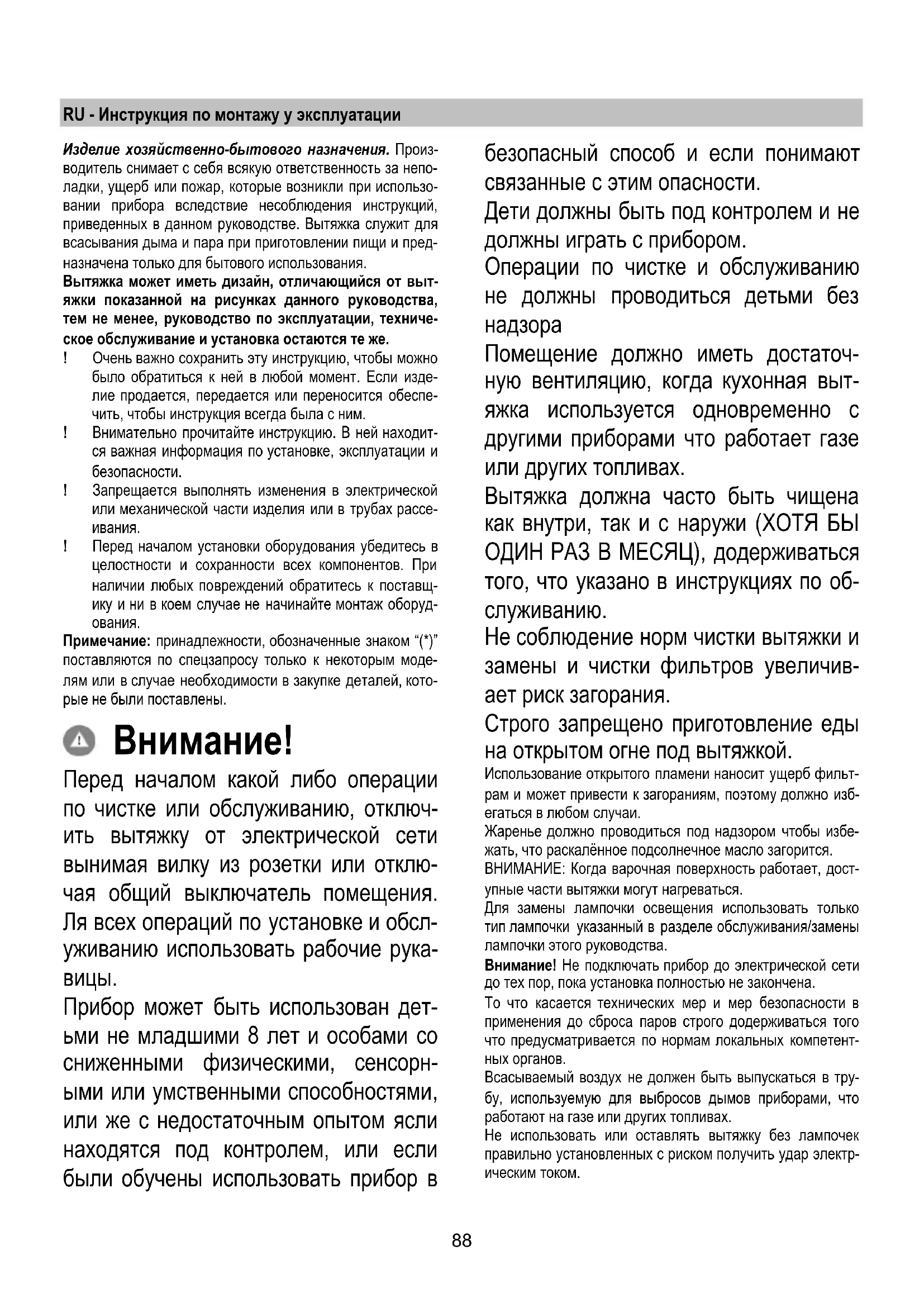 Dacă plafoniera nu se aprinde, controla ţi dacă aţi introdus bine becurile înainte de a chema Asistenţa tehnică.88 RU - Инструкция по монтажу у эксплуатации Изделие хозяйственно-бытового назначения. Произ- водитель снимает с себя всякую ответственность за непо- ладки, ущерб или пожар, которые возникли при использо- вании прибора вследствие несоблюдения инструкций, приведенных в данном руководстве. Вытяжка служит для всасывания дыма и пара при приготовлении пищи и пред- назначена только для бытового использования. Вытяжка может иметь дизайн, отличающийся от выт- яжки показанной на рисунках данного руководства, тем не менее, руководство по эксплуатации, техниче- ское обслуживание и установка остаются те же. ! Очень важно сохранить эту инструкцию, чтобы можно было обратиться к ней в любой момент. Если изде- лие продается, передается или переносится обеспе- чить, чтобы инструкция всегда была с ним. ! Внимательно прочитайте инструкцию. В ней находит- ся важная информация по установке, эксплуатации и безопасности. ! Запрещается выполнять изменения в электрической или механической части изделия или в трубах рассе-