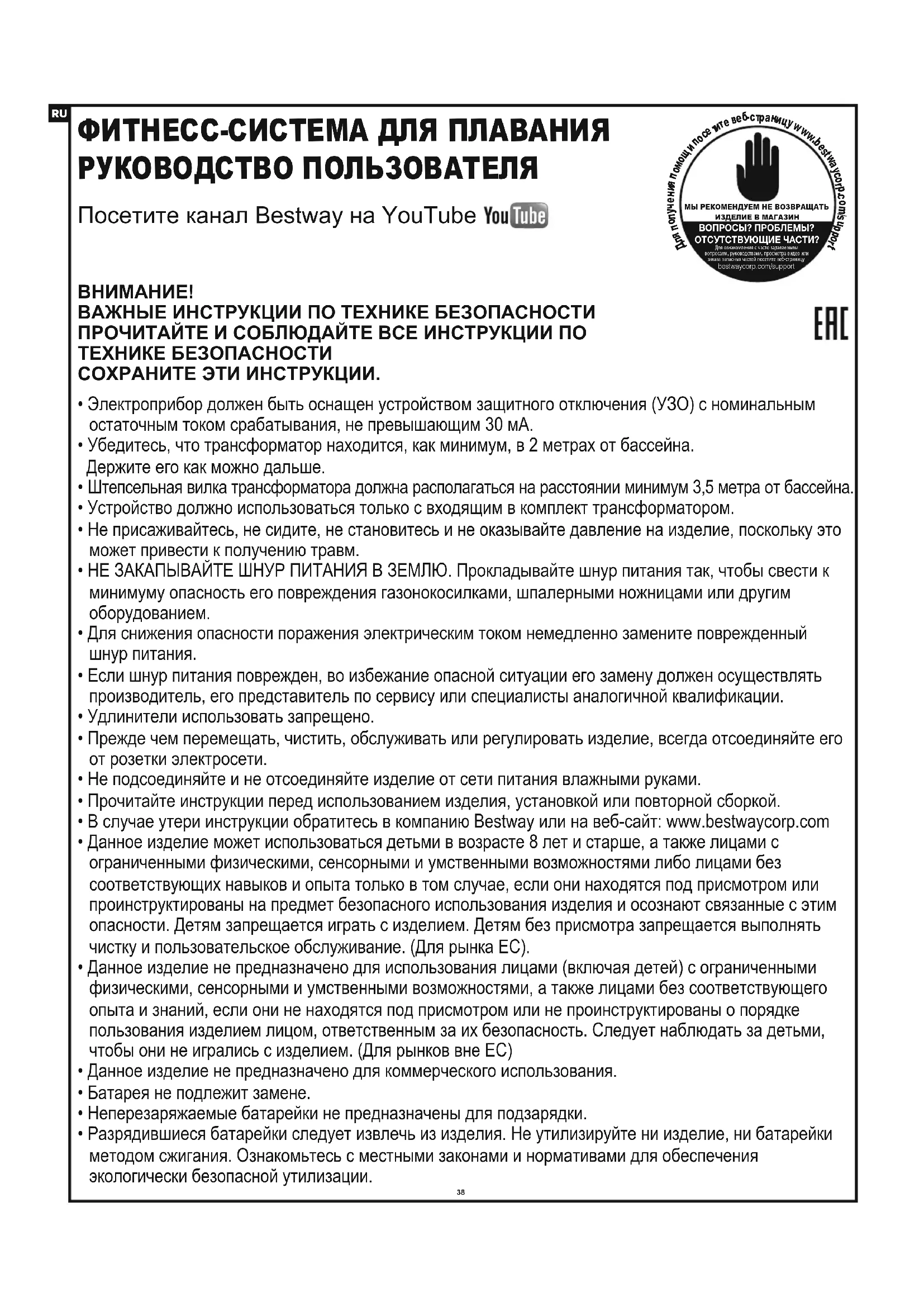 МЫ РЕКОМЕНДУЕМ НЕ ВОЗВРАЩАТЬИЗДЕЛИЕ В МАГАЗИНВОПРОСЫ? ПРОБЛЕМЫ?ОТСУТСТВУЮЩИЕ ЧАСТИ? Для ознакомления с часто задаваемыми вопросами, руководствами, просмотра видео или заказа запасных частей посетите веб-страницу bestwaycorp.com/support