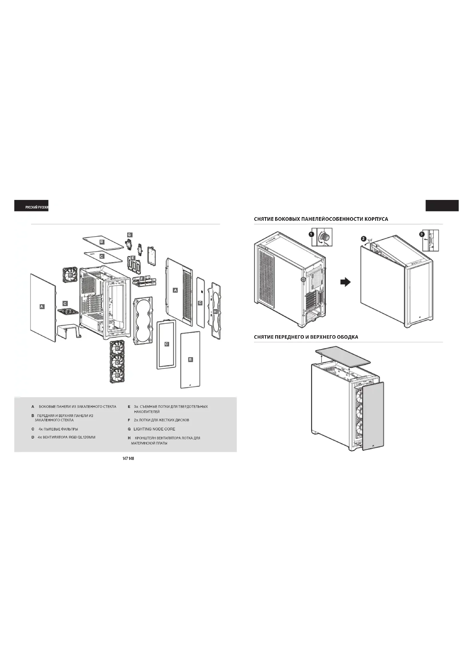 СНЯТИЕ ПЕРЕДНЕГО И ВЕРХНЕГО ОБОДКА A БОКОВЫЕ ПАНЕЛИ ИЗ ЗАКАЛЕННОГО СТЕКЛА B ПЕРЕДНЯЯ И ВЕРХНЯЯ ПАНЕЛИ ИЗ ЗАКАЛЕННОГО СТЕКЛА C 4x ПЫЛЕВЫЕ ФИЛЬТРЫ D 4x ВЕНТИЛЯТОРА RGB QL120MM E 3x СЪЕМНЫЕ ЛОТКИ ДЛЯ ТВЕРДОТЕЛЬНЫХ НАКОПИТЕЛЕЙ F 2x ЛОТКИ ДЛЯ ЖЕСТКИХ ДИСКОВ
