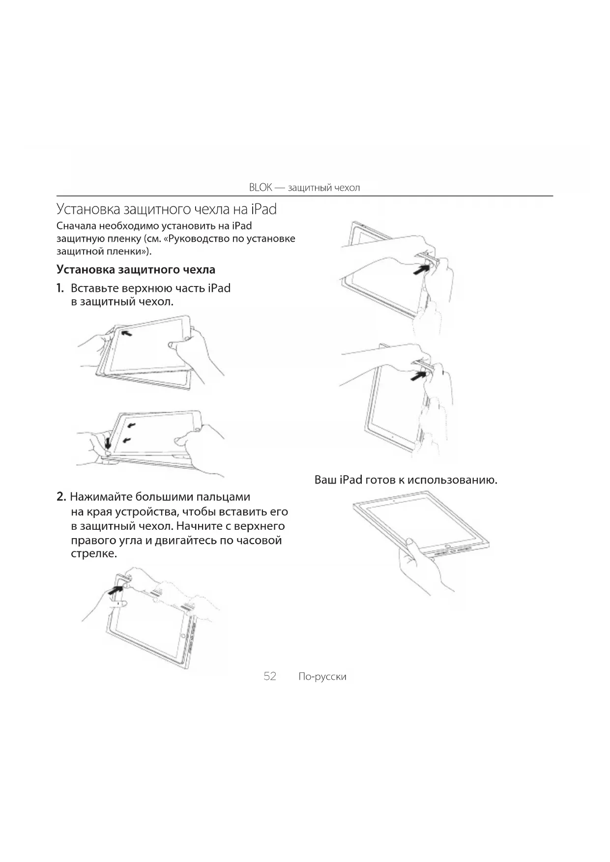 пользователя52 По-русски BLOK — защитный чехол Установка защитного чехла на iPad Сначала необходимо установить на iPad защитную пленку (см. «Руководство по установке защитной пленки»). Установка защитного чехла