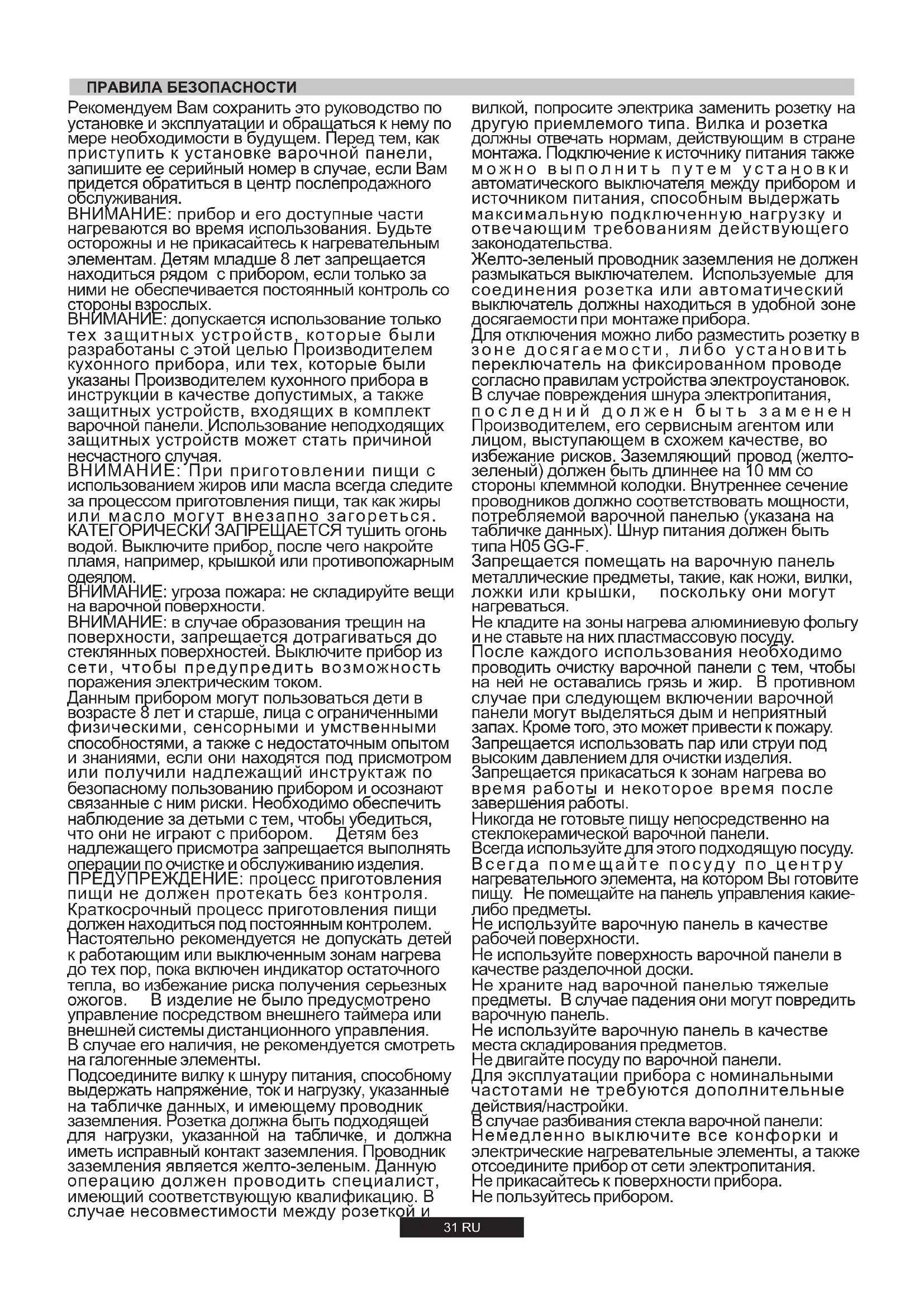 ВНИМАНИЕ: в случае образования трещин на поверхности, запрещается дотрагиваться до стеклянных поверхностей. Выключите прибор из сети, чтобы предупредить возможность поражения электрическим током. Рекомендуем Вам сохранить это руководство по установке и эксплуатации и обращаться к нему по мере необходимости в будущем. Перед тем, как приступить к установке варочной панели, запишите ее серийный номер в случае, если Вам придется обратиться в центр послепродажного обслуживания. Данным прибором могут пользоваться дети в возрасте 8 лет и старше, лица с ограниченными физическими, сенсорными и умственными способностями, а также с недостаточным опытом и знаниями, если они находятся под присмотром или получили надлежащий инструктаж по безопасному пользованию прибором и осознают связанные с ним риски. Необходимо обеспечить наблюдение за детьми с тем, чтобы убедиться, что они не играют с прибором. Детям без надлежащего присмотра запрещается выполнять операции по очистке и обслуживанию изделия. Подсоедините вилку к шнуру питания, способному выдержать напряжение, ток и нагрузку, указанные на табличке данных, и имеющему проводник заземления. Розетка должна быть подходящей для нагрузки, указанной на табличке, и должна иметь исправный контакт заземления. Проводник заземления является желто-зеленым. Данную операцию должен проводить специалист, имеющий соответствующую квалификацию. В случае несовместимости между розеткой и ВНИМАНИЕ: угроза пожара: не складируйте вещи на варочной поверхности. ВНИМАНИЕ: прибор и его доступные части нагреваются во время использования. Будьте осторожны и не прикасайтесь к нагревательным элементам. Детям младше 8 лет запрещается находиться рядом с прибором, если только за ними не обеспечивается постоянный контроль со стороны взрослых. В случае его наличия, не рекомендуется смотреть на галогенные элементы. Настоятельно рекомендуется не допускать детей к работающим или выключенным зонам нагрева до тех пор, пока включен индикатор остаточного тепла, во избежание риска получения серьезных ожогов. В изделие не было предусмотрено управление посредством внешнего таймера или внешней системы дистанционного управления. ПРЕДУПРЕЖДЕНИЕ: процесс приготовления пищи не должен протекать без контроля. Краткосрочный процесс приготовления пищи должен находиться под постоянным контролем. ПРАВИЛА БЕЗОПАСНОСТИ Не прикасайтесь к поверхности прибора. Не кладите на зоны нагрева алюминиевую фольгу и не ставьте на них пластмассовую посуду. После каждого использования необходимо проводить очистку варочной панели с тем, чтобы на ней не оставались грязь и жир. В противном случае при следующем включении варочной панели могут выделяться дым и неприятный запах. Кроме того, это может привести к пожару. Никогда не готовьте пищу непосредственно на стеклокерамической варочной панели. В случае повреждения шнура электропитания, последний должен быть заменен Производителем, его сервисным агентом или лицом, выступающем в схожем качестве, во избежание рисков. Заземляющий провод (желто- зеленый) должен быть длиннее на 10 мм со стороны клеммной колодки. Внутреннее сечение проводников должно соответствовать мощности, потребляемой варочной панелью (указана на табличке данных). Шнур питания должен быть типа .H05 GG-F Не используйте в