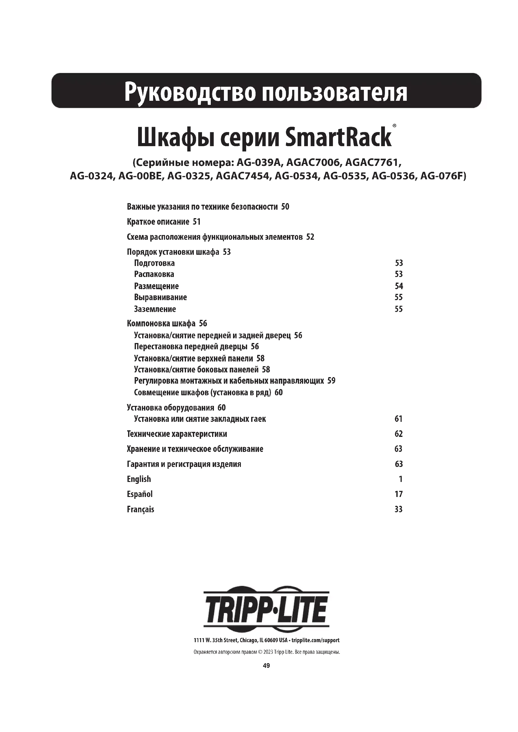 (Серийные номера: AG-039A, AGAC7006, AGAC7761, AG-0324, AG-00BE, AG-0325, AGAC7454, AG-0534, AG-0535, AG-0536, AG-076F) Руководство пользователя Важные указания по технике безопасности 50 Краткое описание 51 Схема расположения функциональных элементов 52 Порядок установки шкафа 53 Подготовка 53 Распаковка 53 Размещение 54 Выравнивание 55 Заземление 55 Компоновка шкафа 56 Установка/снятие передней и задней дверец 56 Перестановка передней дверцы 56 Установка/снятие верхней панели 58 Установка/снятие боковых панелей 58 Регулировка монтажных и кабельных направляющих 59 Совмещение шкафов (установка в ряд) 60 Установка оборудования 60 Установка или снятие закладных гаек 61 Технические характеристики 62 Хранение и техническое обслуживание 63 Гарантия и регистрация изделия 63 English 1 Español 17 Français 33 1111 W. 35th Street, Chicago, IL 60609 USA • tripplite.com/support Охраняется авторским правом © 2023 Tripp Lite. Все права защищены.50 Важные указания по технике безопасности СОХРАНИТЕ НАСТОЯЩИЕ УКАЗАНИЯ Во всех разделах настоящего руководства содержатся указания и предупреждения, которые необходимо соблюдать в процессе установки и эксплуатации описанных в нем шкафов серии SmartRack. Внимательно ознакомьтесь со всеми указаниями и предупреждениями перед выполнением любых действий, связанных с перемещением, установкой или эксплуатацией шкафов серии SmartRack, описанных в настоящем руководстве. Несоблюдение данного требования создаст опасность получения травм или возникновения имущественного ущерба и может привести к аннулированию гарантии.