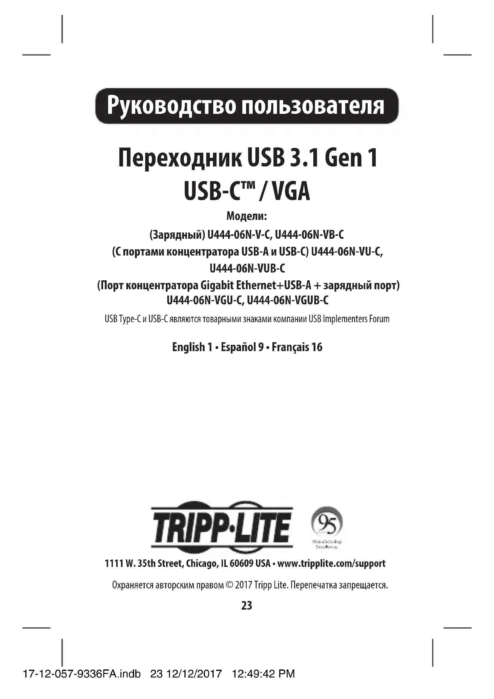 USB Type-C и USB-C являются товарными знаками компании USB Implementers Forum 1111 W. 35th Street, Chicago, IL 60609 USA • www.tripplite.com/support Охраняется авторским правом © 2017 Tripp Lite. Перепечатка запрещается. English 1 • Español 9 • Français 16 17-12-057-9336FA.indb 23 12/12/2017 12:49:42 PM24 Комплект поставки Характеристики продукта