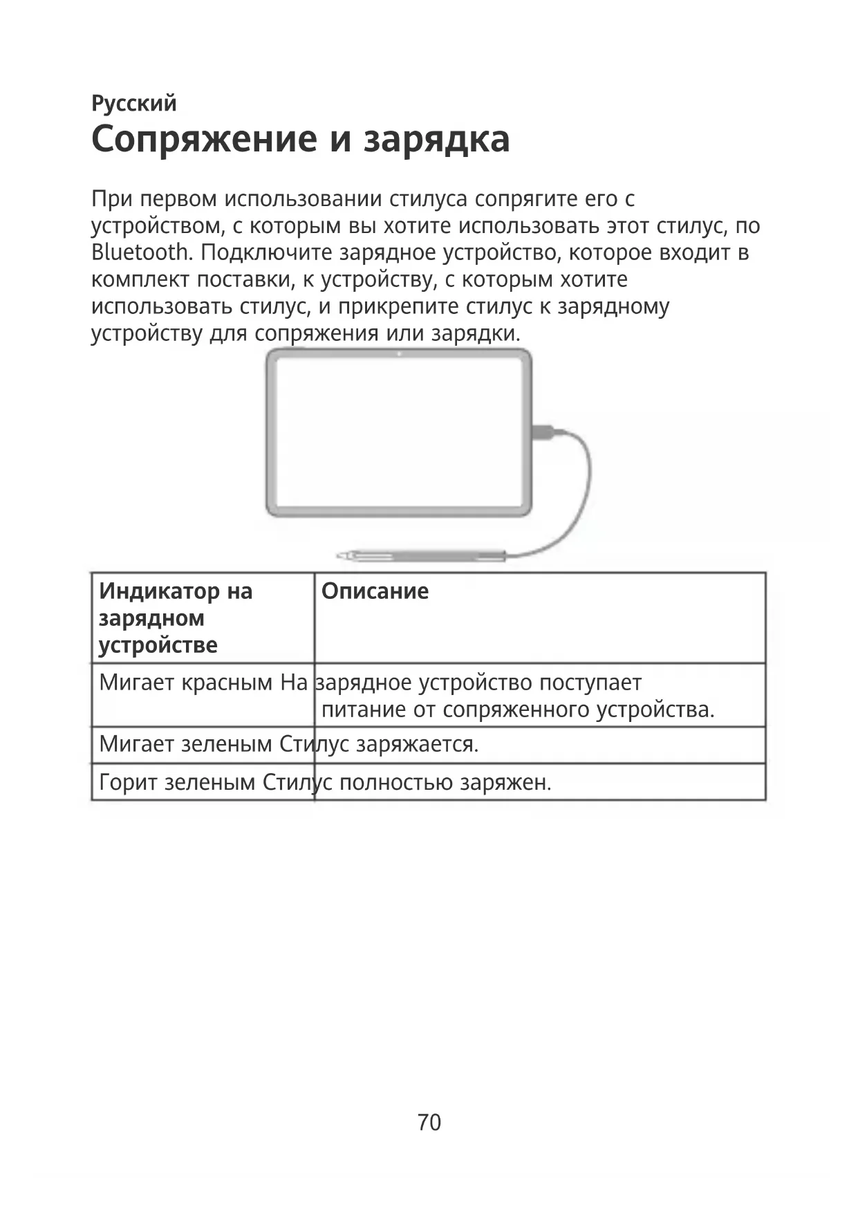 Мигает красным На зарядное устройство поступает питание от сопряженного устройства. Мигает зеленым Стилус заряжается. Горит зеленым Стилус полностью заряжен. 70• На сопряженном устройстве должна быть установлена версия EMUI 10.1 и выше.