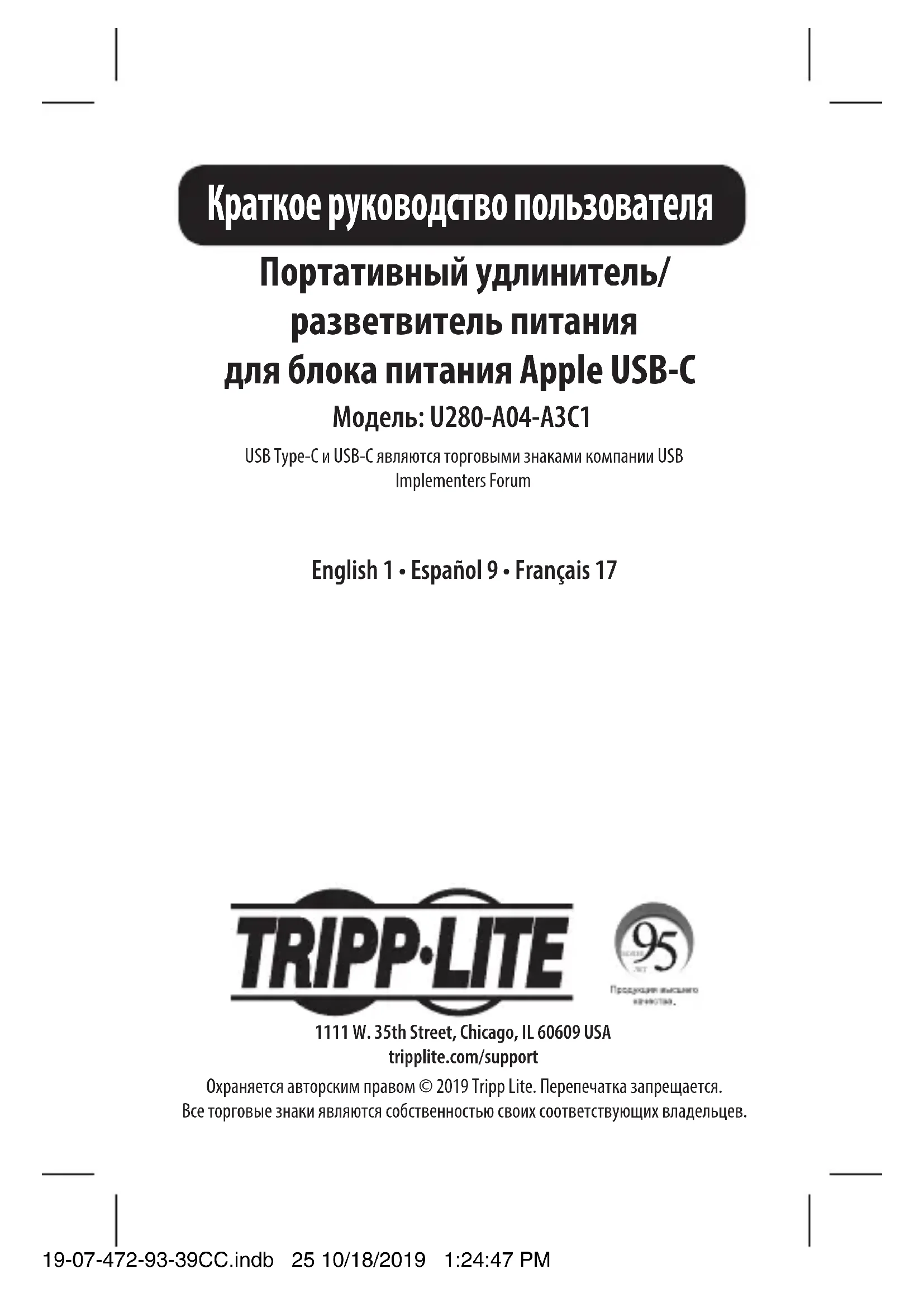 - Отправку нового оборудования на переработку после окончательной выработки его ресурса Гарантийные обязательства 19-07-472-93-39CC.indb 31 10/18/2019 1:24:47 PM32 19-07-472 93-39CC_RevA 1111 W. 35th Street, Chicago, IL 60609 USA tripplite.com/support Компания Tripp Lite постоянно совершенствует свою продукцию. В связи с этим возможно изменение технических характеристик без предварительного уведомления. Внешний вид реальных изделий может несколько отличаться от представленного на фотографиях и иллюстрациях. Гарантийные обязательства 19-07-472-93-39CC.indb 32 10/18/2019 1:24:47 PM