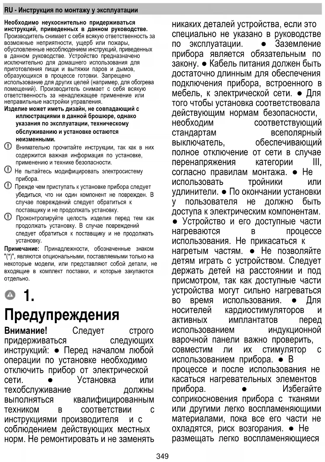 Предупреждения Внимание! Следует строго придерживаться следующих инструкций: ● Перед началом любой операции по установке необходимо отключить прибор от электрической сети. ● Установка или техобслуживание должны выполняться квалифицированным техником в соответствии с инструкциями производителя и с соблюдением действующих местных норм. Не ремонтировать и не заменять никаких деталей устройства, если это специально не указано в руководстве по эксплуатации. ● Заземление прибора является обязательным по закону. ● Кабель питания должен быть достаточно длинным для обеспечения подключения прибора, встроенного в мебель, к электрической сети. ● Для того чтобы установка соответствовала действующим нормам безопасности, необходим соответствующий стандартам всеполярный выключатель, обеспечивающий полное отключение от сети в случае перенапряжения категории III, согласно правилам монтажа. ● Не использовать тройники или удлинители. ● По окончании установки у пользователя не должно быть доступа к электрическим компонентам. ● Устройство и его доступные части нагреваются в процессе использования. Не прикасаться к нагретым частям. ● Не позволяйте детям играть с устройством. Следует держать детей на расстоянии и под присмотром, так как доступные части устройства могут сильно нагреваться во время использования. ● Для носителей кардиостимуляторов и активных имплантатов перед использованием индукционной варочной панели важно проверить, совместим ли их стимулятор с использованием прибора. ● В процессе и после использования не касаться нагревательных элементов прибора. ● Избегайте соприкосновения прибора с тканями или другими легко воспламеняющими материалами, пока все его части не охладятся, риск возгорания. ● Не размещать легко воспламеняющиеся350 материалы на приборе или вблизи него. ● При сильном нагревании жиры и масла легко воспламеняются. Необходимо следить за приготовлением продуктов с большим содержанием жиров и масла. - Если на поверхности имеются трещины, следует выключить прибор во избежание поражения электрическим током. ● Прибор не предназначен для включения через внешний таймер или отдельную систему дистанционного управления. ● Готовка без присмотра на варочной панели с использованием растительного масла или жира опасна и может привести к пожару. ● За приготовлением пищи нужно следить. Процесс быстрой готовки должен проходить под постоянным надзором. ● НИКОГДА не пытайтесь гасить огонь водой. Следует выключить прибор и погасить огонь, например, при помощи крышки или противопожарного одеяла. Опасность пожара: не кладите предметы на варочную поверхность. ● Не применяйте системы очистки паром, риск удара электрическим током. ● Не кладите металлические предметы, такие как ножи, вилки, ложки и крышки на варочную поверхность, так как они могут сильно нагреться. ● Перед подключением прибора к электросети: проверьте табличку с данными (расположенную в нижней части прибора), чтобы убедиться, что его напряжение и мощность соответствуют напряжению сети и что разъем для подключения подходящий. При возникновении сомнений следует обратиться к квалифицированному электрику. Важно: ● После использования выключить варочную панель при помощи соответствующего устройства управления, не полагаясь на детектор 
