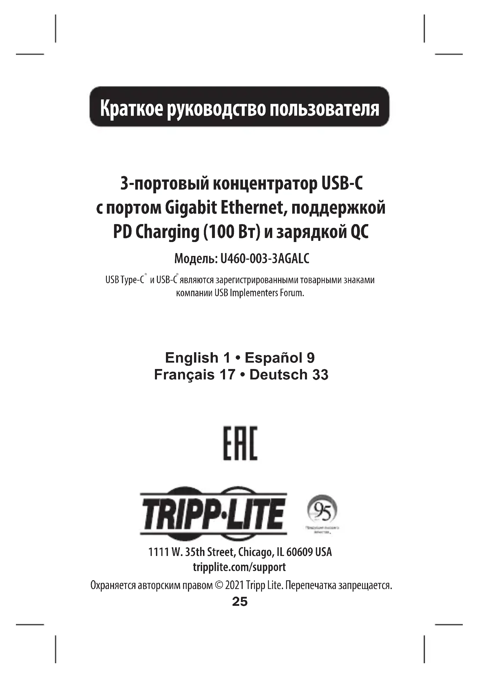 - Oтправку нового оборудования на переработку после окончательной выработки его pecypca Не рекомендуется использование данного оборудования в системах жизнеобеспечения, где его выход из строя предположительно может привести к перебоям в работе оборудования жизнеобеспечения или в значительной мере снизить его безопасность или эффективность. Компания Tripp Lite постоянно совершенствует свою продукцию. B связи с этим возможно изменение технических характеристик без предварительного уведомления. Внешний вид реальных изделий может несколько отличаться от представленного на фотографиях и иллюстрациях.33 1111 W. 35th Street, Chicago, IL 60609 USA tripplite.com/support Copyright © 2021 Tripp Lite. Alle Rechte vorbehalten. Kurzanleitung USB-C-Hub mit 3 Anschlüssen, Gigabit-Ethernet, 100 W PD- Aufladung und QC-Aufladung Modell: U460-003-3AGALC USB Type-C