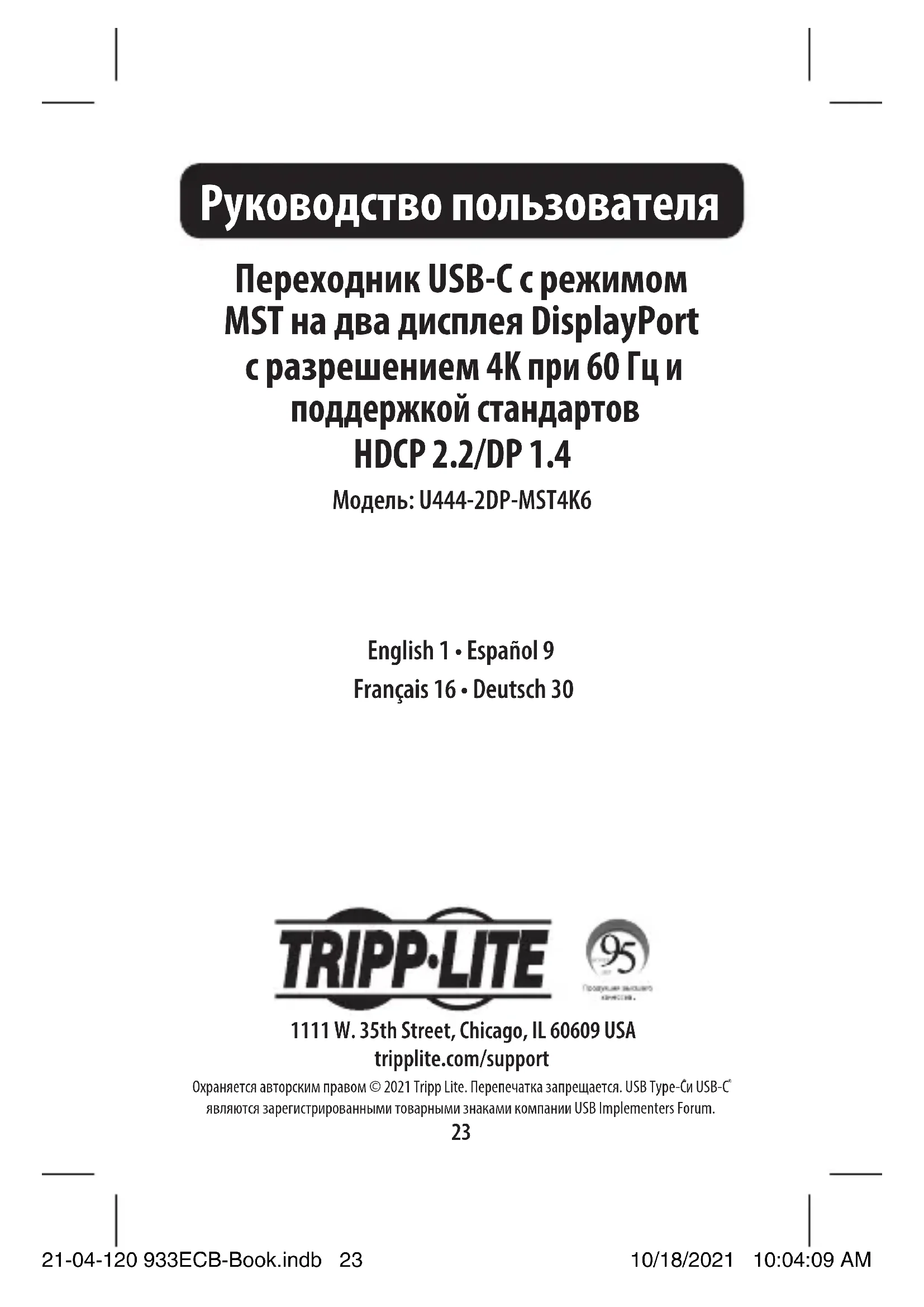 являются зарегистрированными товарными знаками компании USB Implementers Forum. Руководство пользователя Переходник USB-C с режимом MST на два дисплея DisplayPort с разрешением 4K при 60 Гц и поддержкой стандартов HDCP 2.2/DP 1.4 Модель: U444-2DP-MST4K6 English 1 • Español 9 Français 16 • Deutsch 30 21-04-120 933ECB-Book.indb 2321-04-120 933ECB-Book.indb 23 10/18/2021 10:04:09 AM10/18/2021 10:04:09 AM24 Содержимое упаковки Характеристики изделия