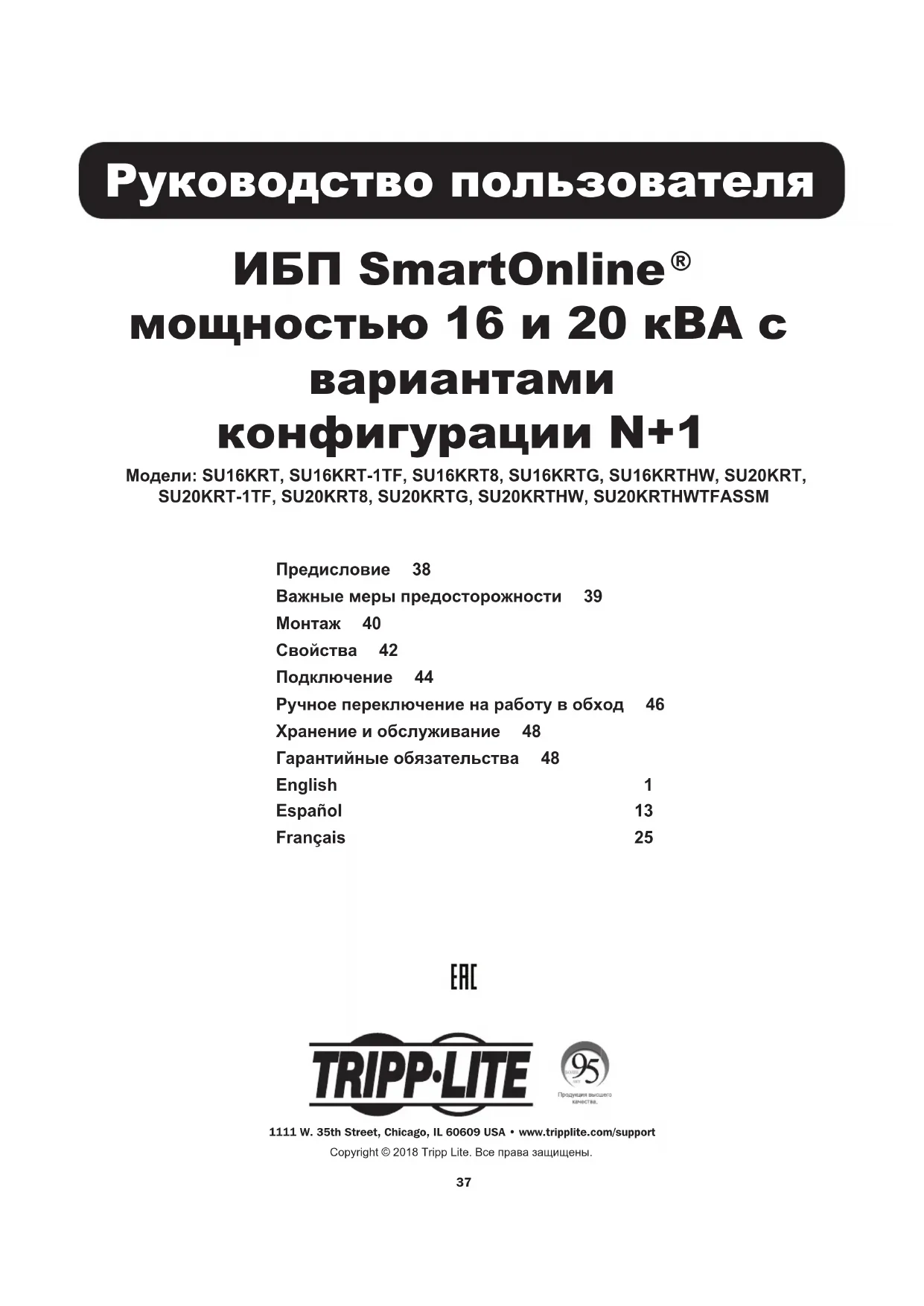 конфигурации N+1 Модели: SU16KRT, SU16KRT-1TF, SU16KRT8, SU16KRTG, SU16KRTHW, SU20KRT, SU20KRT-1TF, SU20KRT8, SU20KRTG, SU20KRTHW, SU20KRTHWTFASSM Предисловие 38 Важныемерыпредосторожности 39 Монтаж 40 Свойства 42 Подключение 44 Ручноепереключениенаработувобход 46 Хранениеиобслуживание 48 Гарантийныеобязательства 48 English 1 Español 13 Français 25 1111 W. 35th Street, Chicago, IL 60609 USA • www.tripplite.com/supportCopyright © 2018 Tripp Lite. Все права защищены.38 Предисловие ИБП Tripp Lite мощностью 16/20 кВА имеет два силовых модуля мощностью 8/10 кВА каждый с параллельно подключенным PDU и кабелем связи, обеспечивающим суммирование мощностей двух силовых модулей для непосредственной подачи питания на подключенное оборудование. ИБП автоматически обеспечивает отказоустойчивый режим работы с избыточностью N+1 при уровнях нагрузки до 50% и возможность работы без резервирования при уровнях нагрузки более 50%. Поставляемый в комплекте PDU (с переключателем на обходную цепь) для параллельного подключения также обеспечивает возможность «горячей» замены любого из силовых модулей или обоих одновременно без вынужденного простоя. За дополнительной помощью по вопросам конфигурирования обращайтесь в компанию Tripp Lite. Конфигурация для резервной мощности 10КВА (максимальная нагрузка 10КВА) Конфигурация для резервной мощности 20КВА (максимальная нагрузка 20КВА) В целях обеспечения отказоустойчивости, подайте нагрузку на две параллельные системы бесперебойного электроснабжения максимум на 50% от общей номинальной мощности обеих систем бесперебойного электроснабжения. Например, когда у вас имеются две системы бесперебойного электроснабжения на 10КВА, вы обеспечиваете абсолютно отказоустойчивую работу, если нагрузка остается на уровне 10КВА или ниже. Вы можете использовать эту конфигурацию для увеличения допустимой мощности своего ИБП до 16КВА (если применяются две системы бесперебойного электроснабжения, на 8КВА каждая) или до 20КВА (если применяются две системы бесперебойного электроснабжения, на 10КВА каждая). При данной конфигурации НЕ обеспечивается отказоустойчивость. Для конфигураций ИБП мощностью 16/20 кВА