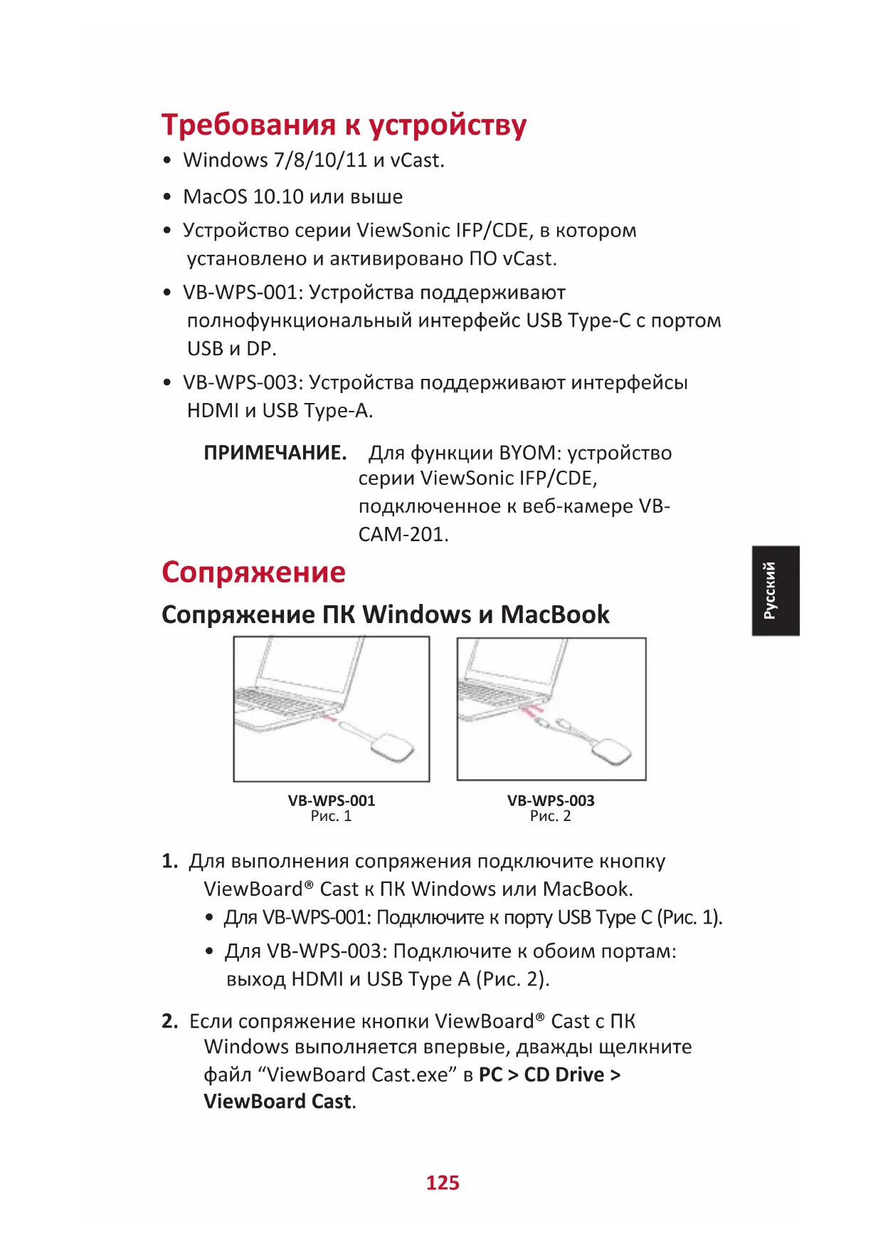 - VB-WPS-003: Устройства поддерживают интерфейсы HDMI и USB Type-A. ПРИМЕЧАНИЕ. Для функции BYOM: устройство серии ViewSonic IFP/CDE, подключенное к веб-камере VB- CAM-201.