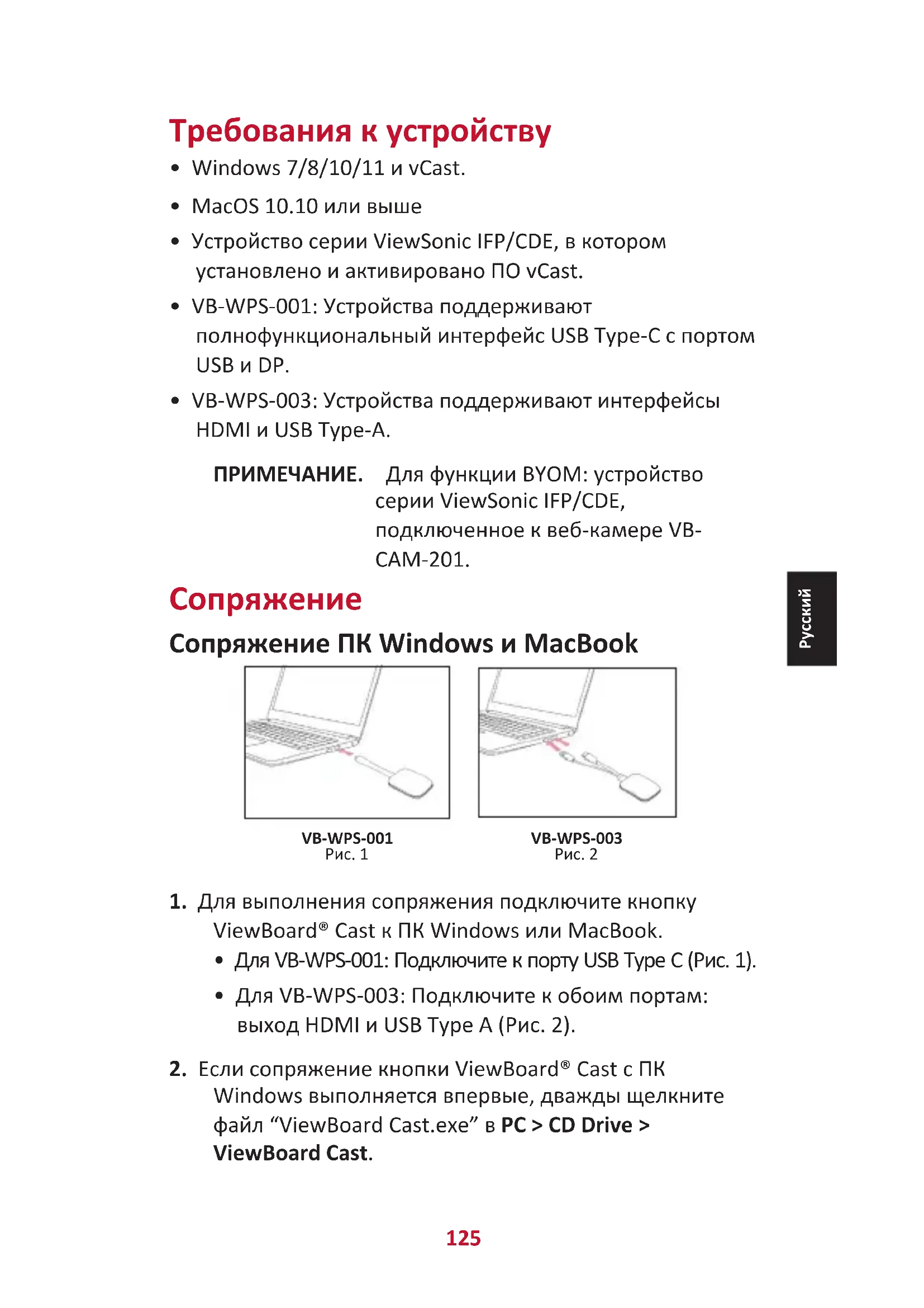 - VB-WPS-003: Устройства поддерживают интерфейсы HDMI и USB Type-A. ПРИМЕЧАНИЕ. Для функции BYOM: устройство серии ViewSonic IFP/CDE, подключенное к веб-камере VB- CAM-201.