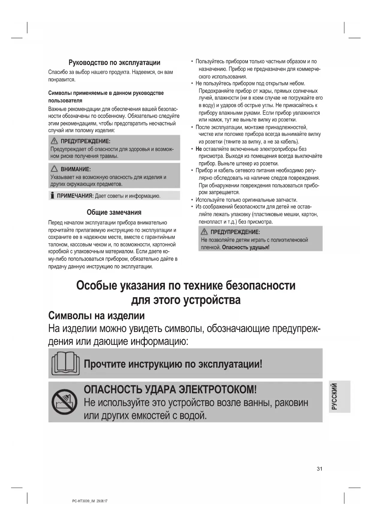 - Из соображений безопасности для детей не остав- ляйте лежать упаковку (пластиковые мешки, картон, пенопласт и т.д.) без присмотра. ПРЕДУПРЕЖДЕНИЕ: Не позволяйте детям играть с полиэтиленовой пленкой. Опасность удушья! Особые указания по технике безопасности для этого устройства Символы на изделии На изделии можно увидеть символы, обозначающие предупреж- дения или дающие информацию: Прочтите инструкцию по эксплуатации! ОПАСНОСТЬ УДАРА ЭЛЕКТРОТОКОМ! Не используйте это устройство возле ванны, раковин или других емкостей с водой.PC-HT3009_IM 29.08.17