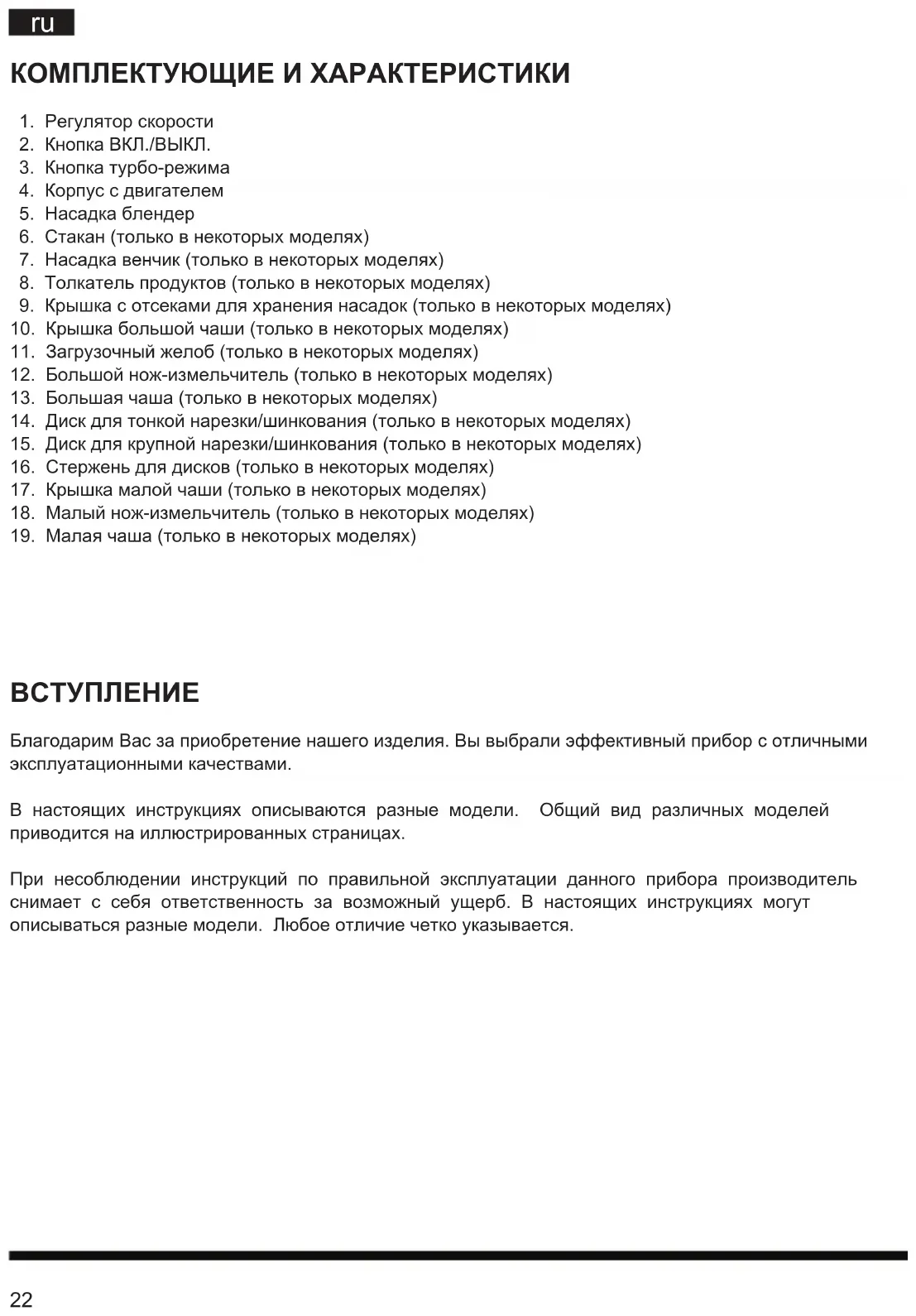 Благодарим Вас за приобретение нашего изделия. Вы выбрали эффективный прибор с отличными эксплуатационными качествами. В настоящих инструкциях описываются разные модели. Общий вид различных моделей приводится на иллюстрированных страницах. При несоблюдении инструкций по правильной эксплуатации данного прибора производитель снимает с себя ответственность за возможный ущерб. В настоящих инструкциях могут описываться разные модели. Любое отличие четко указывается.23