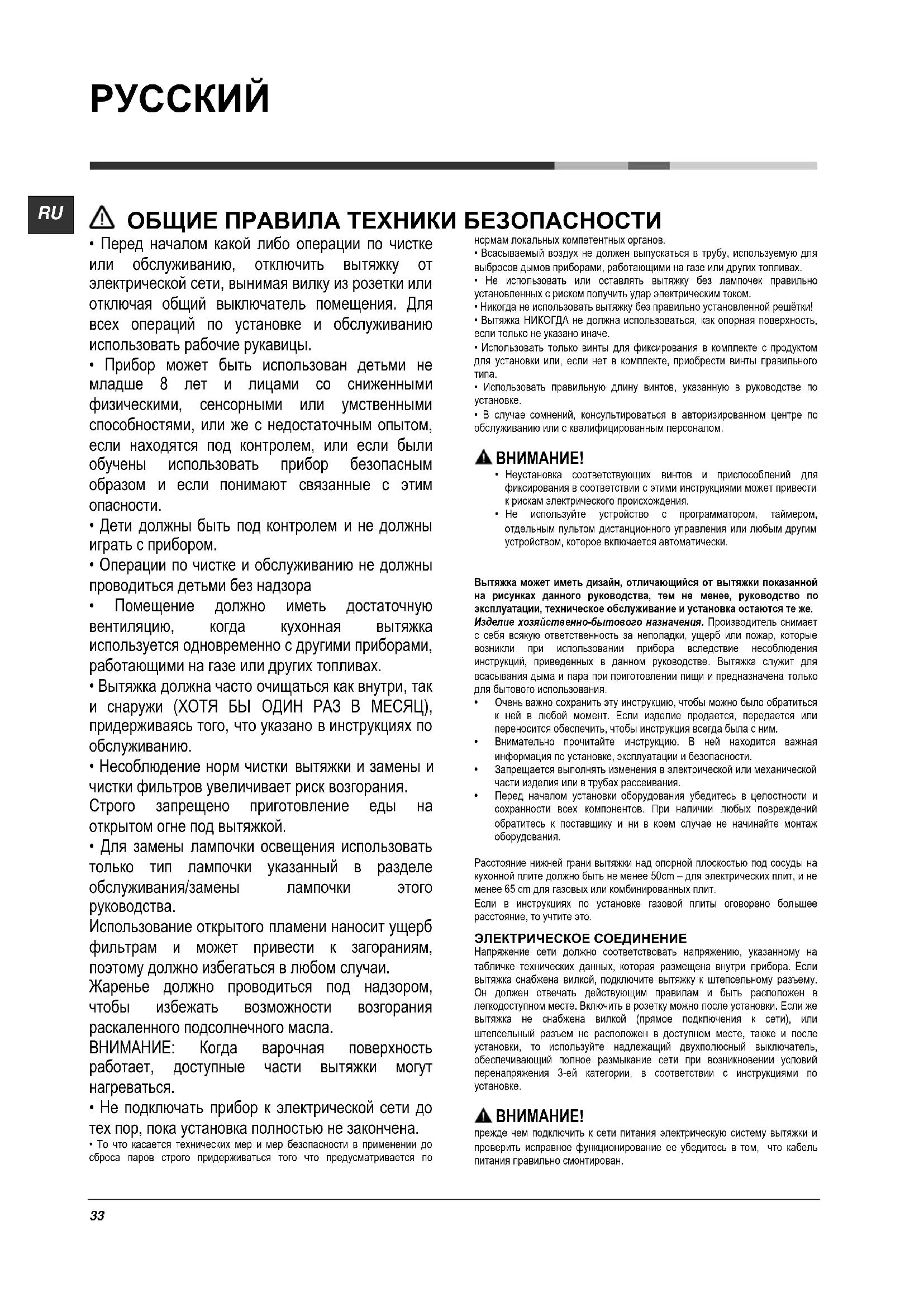 - Перед началом установки оборудования убедитесь в целостности и сохранности всех компонентов. При наличии любых повреждений обратитесь к поставщику и ни в коем случае не начинайте монтаж оборудования. Расстояние нижней грани вытяжки над опорной плоскостью под сосуды на кухонной плите должно быть не менее 50cm – для электрических плит, и не менее 65 cm для газовых или комбинированных плит. Если в инструкциях по установке газовой плиты оговорено большее расстояние, то учтите это. ЭЛЕКТРИЧЕСКОЕ СОЕДИНЕНИЕ Напряжение сети должно соответствовать напряжению, указанному на табличке технических данных, которая размещена внутри прибора. Если вытяжка снабжена вилкой, подключите вытяжку к штепсельному разъему. Он должен отвечать действующим правилам и быть расположен в легкодоступном месте. Включить в розетку можно после установки. Если же вытяжка не снабжена вилкой (прямое подключения к сети), или штепсельный разъем не расположен в доступном месте, также и после установки, то используйте надлежащий двухполюсный выключатель, обеспечивающий полное размыкание сети при возникновении условий перенапряжения 3-ей категории, в соответствии с инструкциями по