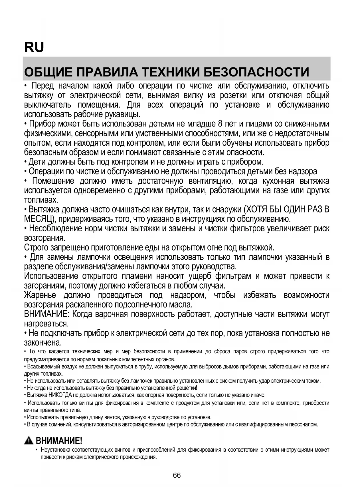 - Вытяжка НИКОГДА не должна использоваться, как опорная поверхность, если только не указано иначе.