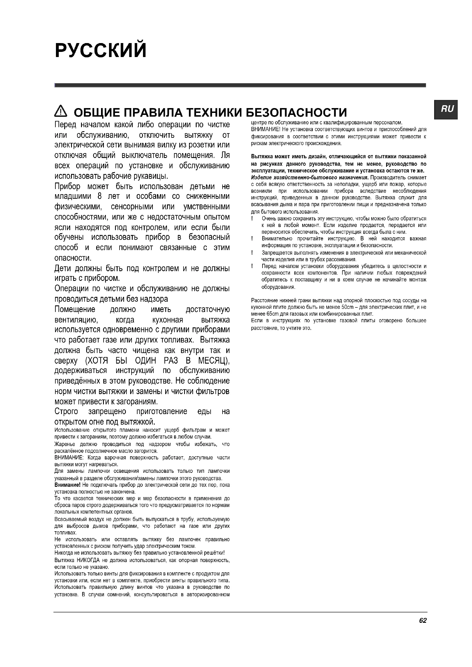 ОБЩИЕ ПРАВИЛА ТЕХНИКИ БЕЗОПАСНОСТИ Перед началом какой либо операции по чистке или обслуживанию, отключить вытяжку от электрической сети вынимая вилку из розетки или отключая общий выключатель помещения. Ля всех операций по установке и обслуживанию использовать рабочие рукавицы. Прибор может быть использован детьми не младшими 8 лет и особами со сниженными физическими, сенсорными или умственными способностями, или же с недостаточным опытом ясли находятся под контролем, или если были обучены использовать прибор в безопасный способ и если понимают связанные с этим