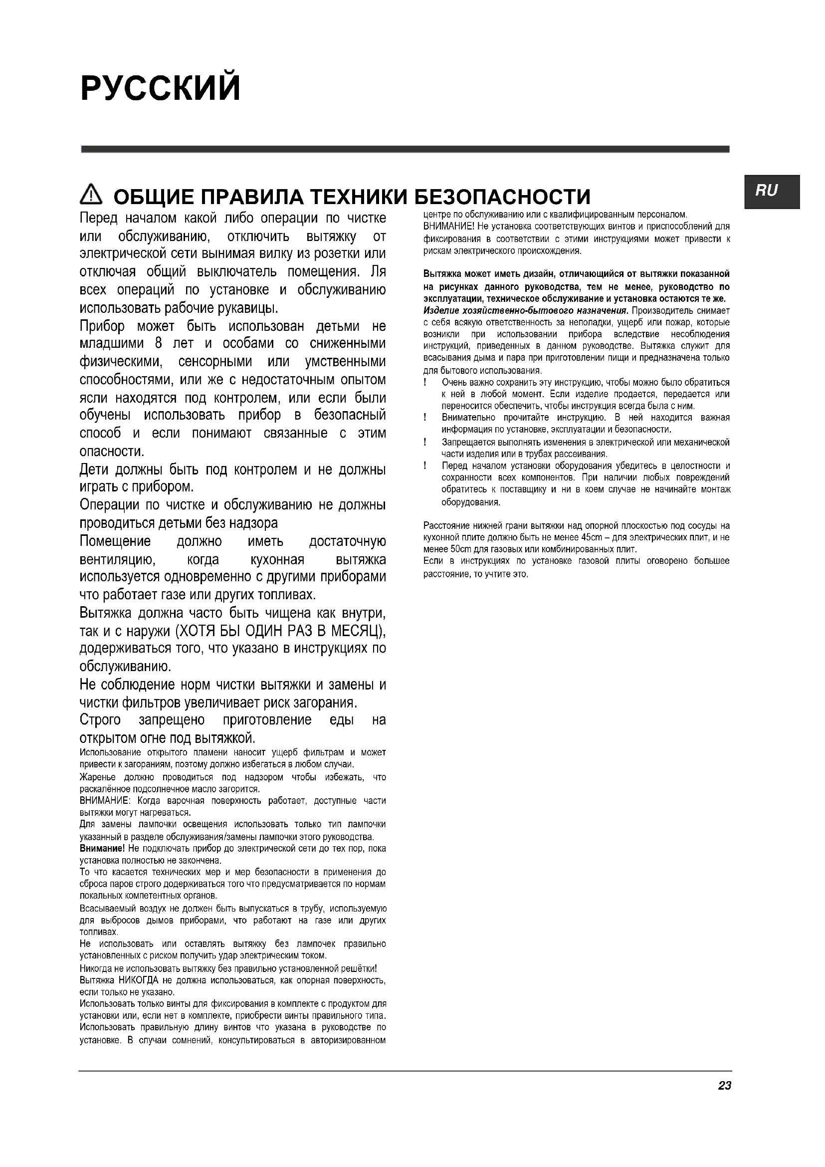 Не использовать или оставлять вытяжку без лампочек правильно установленных с риском получить удар электрическим током. Никогда не использовать вытяжку без правильно установленной решётки! Вытяжка НИКОГДА не должна использоваться, как опорная поверхность, если только не указано. Использовать только винты для фиксирования в комплекте с продуктом для установки или, если нет в комплекте, приобрести винты правильного типа. Использовать правильную длину винтов что указана в руководстве по установке. В случаи сомнений, консультироваться в авторизированном центре по обслуживанию или с квалифицированным персоналом. ВНИМАНИЕ! Не установка соответствующих винтов и приспособлений для фиксирования в соответствии с этими инструкциями может привести к рискам электрического происхождения. Вытяжка может иметь дизайн, отличающийся от вытяжки показанной на рисунках данного руководства, тем не менее, руководство по эксплуатации, техническое обслуживание и установка остаются те же. Изделие хозяйственно-бытового назначения. Производитель снимает с себя всякую ответственность за неполадки, ущерб или пожар, которые возникли при использовании прибора вследствие несоблюдения инструкций, приведенных в данном руководстве. Вытяжка служит для всасывания дыма и пара при приготовлении пищи и предназначена только для бытового использования. ! Очень важно сохранить эту инструкцию, чтобы можно было обратиться к ней в любой момент. Если изделие продается, передается или переносится обеспечить, чтобы инструкция всегда была с ним. ! Внимательно прочитайте инструкцию. В ней находится важная информация по установке, эксплуатации и безопасности. ! Запрещается выполнять изменения в электрической или механической части изделия или в трубах рассеивания. ! Перед началом установки оборудования убедитесь в целостности и сохранности всех компонентов. При наличии любых повреждений обратитесь к поставщику и ни в коем случае не начинайте монтаж оборудования. Расстояние нижней грани вытяжки над опорной плоскостью под сосуды на кухонной плите должно быть не менее 45cm – для электрических плит, и не менее 50cm для газовых или комбинированных плит. Если в инструкциях по установке газовой плиты оговорено большее расстояние, то учтите это.24 ЭЛЕКТРИЧЕСКОЕ СОЕДИНЕНИЕ Напряжение сети должно соответствовать напряжению, указанному на табличке технических данных, которая размещена внутри прибора. Если вытяжка снабжена вилкой, подключите вытяжку к штепсельному разъему. Он должен отвечать действующим правилам и быть расположен в легкодоступном месте. Включить в розетку можно после установки. Если же вытяжка не снабжена вилкой (прямое подключения к сети), или штепсельный разъем не расположен в доступном месте, также и после установки, то используйте надлежащий двухполюсный выключатель, обеспечивающий полное размыкание сети при возникновении условий перенапряжения 3-ей категории, в соответствии с инструкциями по