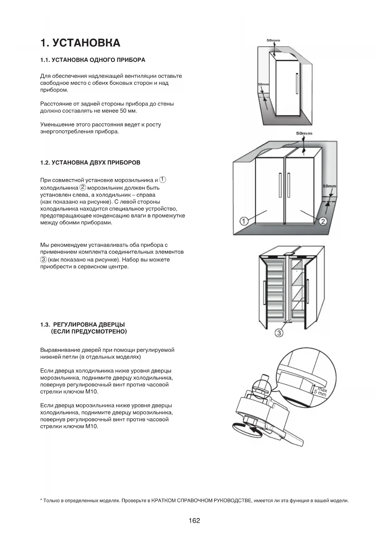 (какпоказанонарисунке).Наборвыможете приобрестивсервисномцентре. 1.3. РЕГУЛИРОВКА ДВЕРЦЫ (ЕСЛИ ПРЕДУСМОТРЕНО) Выравниваниедверейприпомощирегулируемой нижнейпетли(вотдельныхмоделях) Еслидверцахолодильниканижеуровнядверцы морозильника,поднимитедверцухолодильника, повернуврегулировочныйвинтпротивчасовой стрелкиключомM10. Еслидверцаморозильниканижеуровнядверцы холодильника,поднимитедверцуморозильника, повернуврегулировочныйвинтпротивчасовой стрелкиключомM10. *Тольковопределенныхмоделях.ПроверьтевКРАТКОМСПРАВОЧНОМРУКОВОДСТВЕ,имеетсялиэтафункцияввашеймодели. 50mm 50mm 5 mm max163