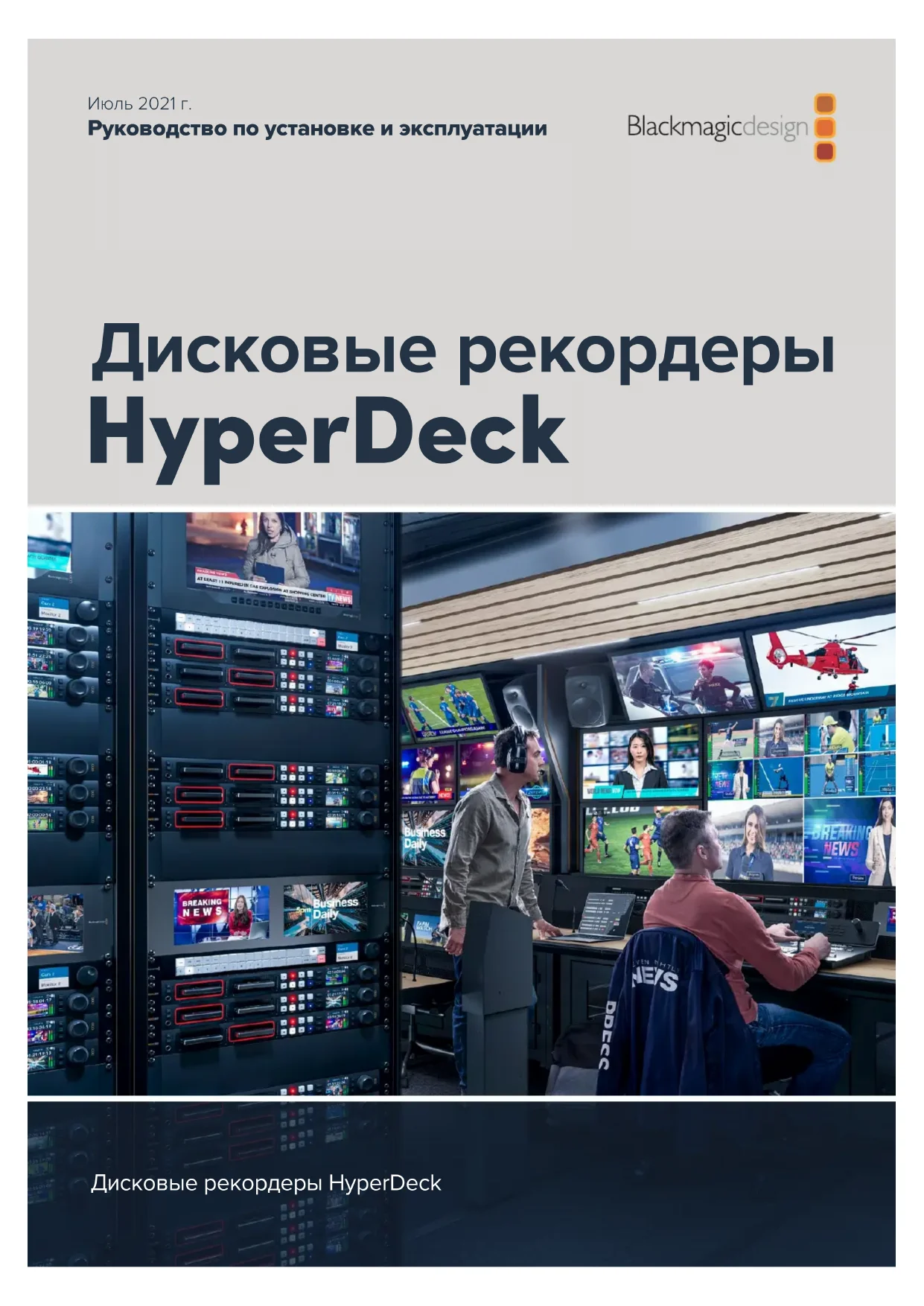 보증Дисковые рекордеры HyperDeck Дисковые рекордеры HyperDeck Июль 2021 г. Руководство по установке и эксплуатацииУважаемый пользователь! Благодарим вас за покупку устройства Blackmagic HyperDeck. Когда мы разрабатывали первые дисковые рекордеры Blackmagic HyperDeck, то стремились создать доступное для каждого решение, которое позволяет записывать ивоспроизводить самое качественное видео с помощью портативных SSD-накопителей размером 2,5дюйма. Сейчас эта линейка пополнилась новыми моделями HyperDeck, допускающими сохранение материала в форматахHD и UltraHD на SD-карты, SSD-носители и флеш-дискиUSB. Кустройствам можно даже подключить станцию Blackmagic MultiDock10G, что позволит записывать и воспроизводить файлы с помощью внешних жестких дисков. Модели HyperDeck Studio Plus иPro имеют привычные органы управления вещательной декой, в том числе круглую ручку поиска для выполнения протяжки, перемотки и прокрутки. Оснащенная механизмом фиксации, она позволяет при воспроизведении клипов интуитивно находить нужные фрагменты, не отрывая глаз от монитора. На передней панели также есть гнездо для подключения наушников и динамик, с помощью которых можно быстро проверять фонограмму непосредственно на рекордере. Надеемся, что HyperDeck послужит вам много лет и станет важным компонентом производственной инфраструктуры. Последнюю версию руководства и обновления ПО для HyperDeck можно найти в разделе поддержки на веб-сайте www.blackmagicdesign.com/ru. Использование актуальной версии ПО гарантирует доступ ко всем имеющимся функциям. Чтобы узнавать о выходе обновлений, зарегистрируйтесь при загрузке ПО. Мы постоянно работаем над совершенствованием наших продуктов, поэтому ваши отзывы помогут нам сделать их еще лучше. Грант Петти Генеральный директор Blackmagic DesignСодержание Обзор дисковых рекордеровHyperDeck 502 Подготовка к работе 503 Подключение питания 503 Подключение источника видео- и аудиосигнала 503 Проверка звука 504 Подключение накопителей 504 Запись видео 506 Запись на несколько накопителей 506 Воспроизведение 507 Воспроизведение видео на HyperDeck 507 Круглая ручка поиска 508 Работа с передней панелью 510 Индикаторы слотов 510 Работа с меню на ЖК-дисплее 511 Настройки 512 Задняя панель 524 Применение выхода для мониторинга 526 Работа с накопителями 529 SD-карта 529 SSD 531 Внешний диск 532 Форматирование накопителя 534 Подготовка накопителя на компьютере 534 Использование HyperDeck вкачествевеб-камеры 535 Выбор источника в качестве веб-камеры 535 Настройка приложения Open Broadcaster 536 Blackmagic HyperDeck Setup 538 Работа с утилитой HyperDeck Setup 538 Вкладка LUTs 539 Обновление встроенного программного обеспечения 540 Teranex Mini Rack Shelf 541 Управление по протоколу RS-422 542 Передача файлов по сети 547 Работа с видеомикшером АТЕМ 549 Процедура постобработки 550 Информация для разработчиков 551 Blackmagic HyperDeck Ethernet Protocol 551 Protocol Commands 551 Protocol Details 555 Помощь 566 Соблюдение нормативных требований 567 Правила безопасности 568 Гарантия 569 501Blackmagic HyperDeck StudioОбзор дисковых рекордеровHyperDeck Новые модели Blackmagic HyperDeck, входящие в линейку HD- и 4K-рекордеров, легко подходят для самых разных производственных систем. HyperDeck Studio HDPro и HyperDeckStudio 4KPro умещаются на одно место в стойке, а также позволяют записывать и воспроизводить файлы с помощью SD-карт и SSD-накопителей размером 9,5мм. Компактные рекордеры HyperDeck Studio HDMini и HyperDeck Studio HDPlus можно легко разместить как на рабочем столе, так и на полке Teranex Mini RackShelf. Все модели способны вести запись 