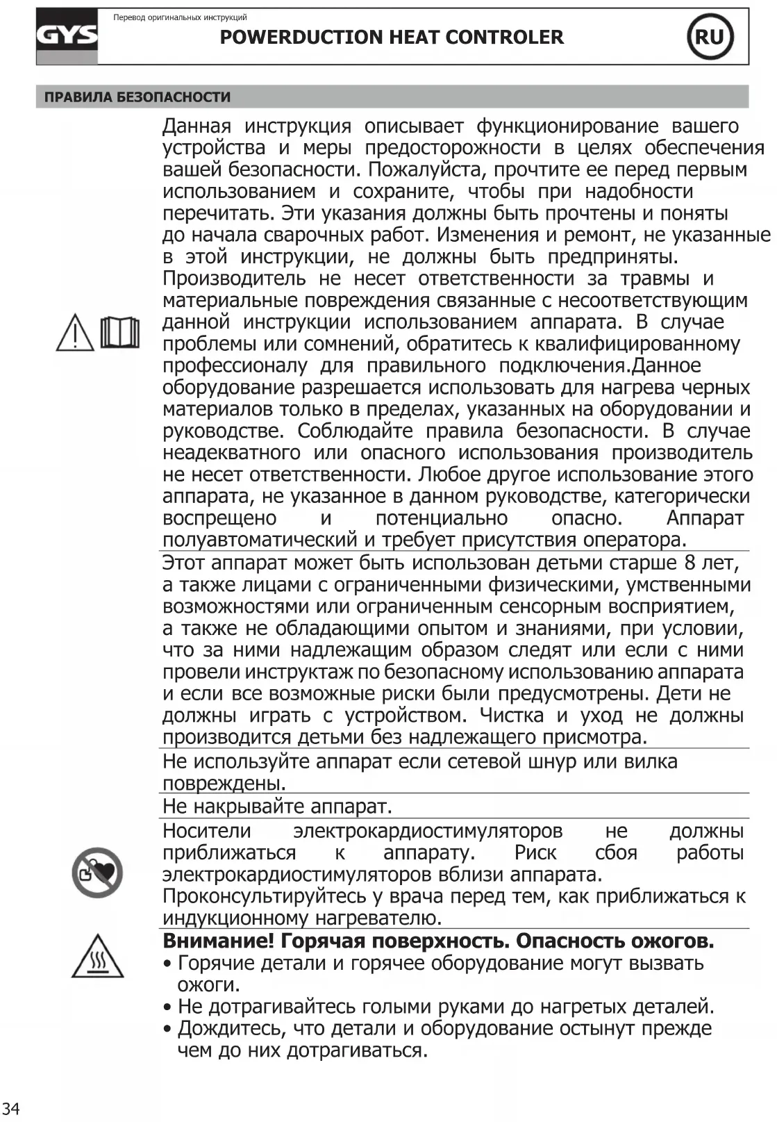 Traducción de las instrucciones originalesПеревод оригинальных инструкций ПРАВИЛА БЕЗОПАСНОСТИ Данная инструкция описывает функционирование вашего устройства и меры предосторожности в целях обеспечения вашей безопасности. Пожалуйста, прочтите ее перед первым использованием и сохраните, чтобы при надобности перечитать. Эти указания должны быть прочтены и поняты до начала сварочных работ. Изменения и ремонт, не указанные в этой инструкции, не должны быть предприняты. Производитель не несет ответственности за травмы и материальные повреждения связанные с несоответствующим данной инструкции использованием аппарата. В случае проблемы или сомнений, обратитесь к квалифицированному профессионалу для правильного подключения.Данное оборудование разрешается использовать для нагрева черных материалов только в пределах, указанных на оборудовании и руководстве. Соблюдайте правила безопасности. В случае неадекватного или опасного использования производитель не несет ответственности. Любое другое использование этого аппарата, не указанное в данном руководстве, категорически воспрещено и потенциально опасно. Аппарат полуавтоматический и требует присутствия оператора. Этот аппарат может быть использован детьми старше 8 лет, а также лицами с ограниченными физическими, умственными возможностями или ограниченным сенсорным восприятием, а также не обладающими опытом и знаниями, при условии, что за ними надлежащим образом следят или если с ними провели инструктаж по безопасному использованию аппарата и если все возможные риски были предусмотрены. Дети не должны играть с устройством. Чистка и уход не должны производится детьми без надлежащего присмотра. Не используйте аппарат если сетевой шнур или вилка повреждены. Не накрывайте аппарат. Носители электрокардиостимуляторов не должны приближаться к аппарату. Риск сбоя работы электрокардиостимуляторов вблизи аппарата. Проконсультируйтесь у врача перед тем, как приближаться к индукционному нагревателю. Внимание! Горячая поверхность. Опасность ожогов.