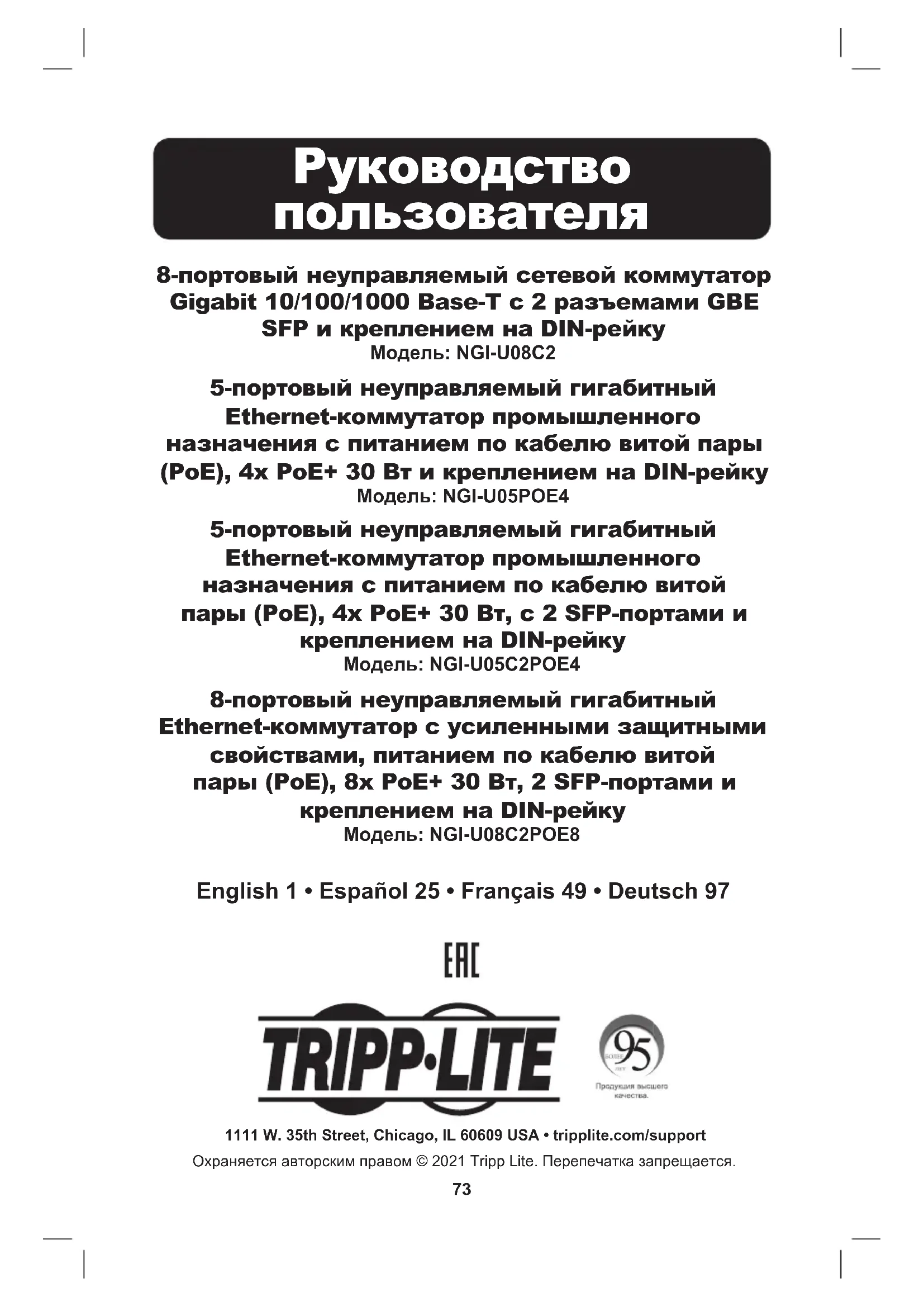 РУКОВОДСТВО ПОЛЬЗОВАТЕЛЯ NGIU05POE4 Tripp Lite