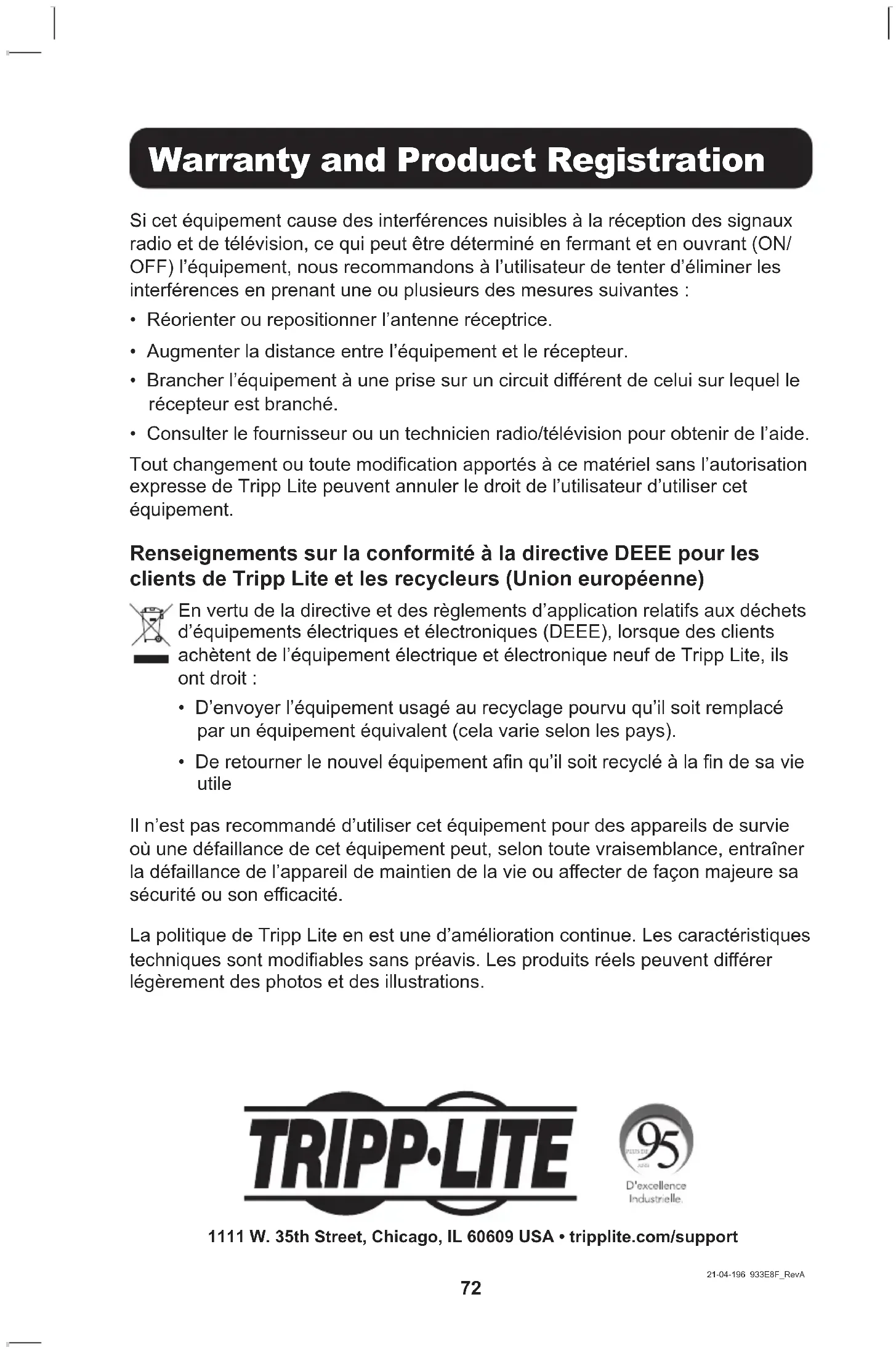 - Oбратиться за помощью к дилеру или опытному специалисту по paдио-/ телеоборудованию. Любыe изменения или модификации в отношении данного оборудования, не одобренные в явной форме компанией Tripp Lite, могут привести к лишению пользoвателя права на эксплуатацию данного оборудовaния. Информация по выполнению требований Директивы WЕЕЕ для покупателей и переработчиков продукции компании Tripp Lite (являющихся резидентами Eврoпейского союза) Согласно положениям Дирeктивы oб утилизации отходов электрического и электронного оборудования (WЕЕЕ) и исполнительных распоряжений по ее применению, при покупке потребителями нового электрического или электронного оборудования производства компании Tripp Lite они получают