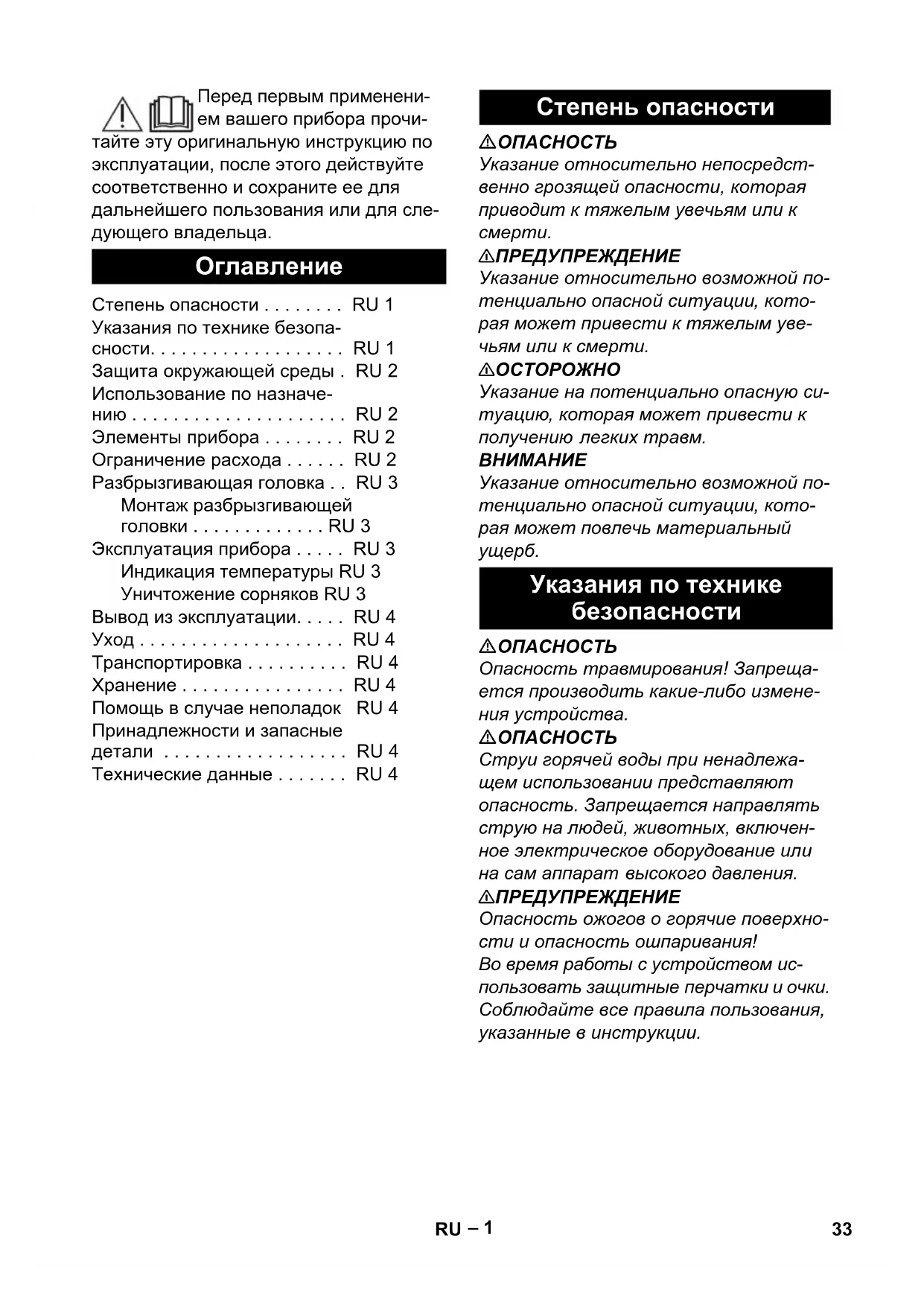 Степень опасности . . . . . . . . RU 1 Указания по технике безопа- сности. . . . . . . . . . . . . . . . . . . RU 1 Защита окружающей среды . RU 2 Использование по назначе- нию . . . . . . . . . . . . . . . . . . . . . RU 2 Элементы прибора . . . . . . . . RU 2 Ограничение расхода . . . . . . RU 2 Разбрызгивающая головка . . RU 3 Монтаж разбрызгивающей головки . . . . . . . . . . . . . RU 3 Эксплуатация прибора . . . . . RU 3 Индикация температуры RU 3 Уничтожение сорняков RU 3 Вывод из эксплуатации. . . . . RU 4 Уход . . . . . . . . . . . . . . . . . . . . RU 4 Транспортировка . . . . . . . . . . RU 4 Хранение . . . . . . . . . . . . . . . . RU 4 Помощь в случае неполадок RU 4 Принадлежности и запасные детали . . . . . . . . . . . . . . . . . . RU 4 Технические данные . . . . . . . RU 4 Степень опасности Указания по технике безопасности 33RU– 2 Упаковочные материалы пригодны для вторичной обработки. Поэтому не выбрасывайте упаковку вместе с до- машними отходами, а сдайте ее в один из пунктов приема вторичного сырья. Старые приборы содержат ценные перерабатываемые материалы, подлежащие передаче в пункты приемки вторичного сырья. Поэтому ути- лизируйте старые приборы через соот- ветствующие системы приемки отходов. Инструкции по применению компо- нентов (REACH) Актуальные сведения о компонентах приведены на веб-узле по следующему