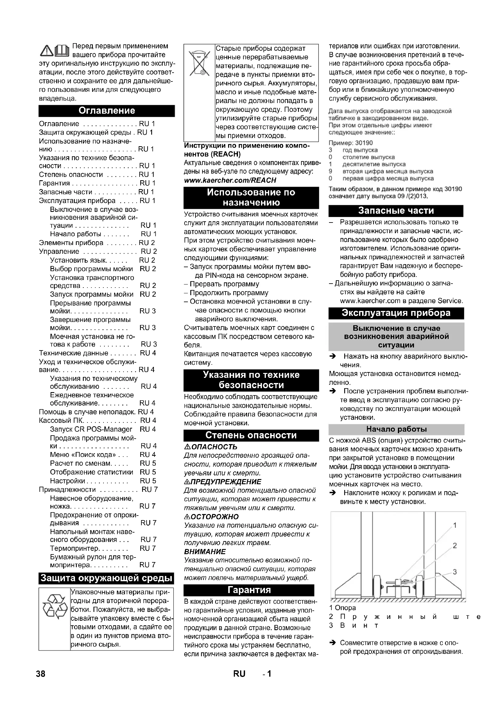 Оглавление . . . . . . . . . . . . . . RU 1 Защита окружающей среды . RU 1 Использование по назначе- нию . . . . . . . . . . . . . . . . . . . . . RU 1 Указания по технике безопа- сности . . . . . . . . . . . . . . . . . . . RU 1 Степень опасности . . . . . . . . RU 1 Гарантия . . . . . . . . . . . . . . . . . RU 1 Запасные части . . . . . . . . . . . RU 1 Эксплуатация прибора . . . . . RU 1 Выключение в случае воз- никновения аварийной си- туации . . . . . . . . . . . . . . RU 1 Начало работы . . . . . . . RU 1 Элементы прибора . . . . . . . . RU 2 Управление . . . . . . . . . . . . . . RU 2 Установить язык. . . . . . RU 2 Выбор программы мойки RU 2 Установка транспортного средства . . . . . . . . . . . . RU 2 Запуск программы мойки RU 2 Прерывание программы мойки. . . . . . . . . . . . . . . RU 3 Завершение программы мойки. . . . . . . . . . . . . . . RU 3 Моечная установка не го- това к работе . . . . . . . . RU 3 Технические данные . . . . . . . RU 4 Уход и техническое обслужи- вание. . . . . . . . . . . . . . . . . . . . RU 4 Указания по техническому обслуживанию . . . . . . . RU 4 Ежедневное техническое обслуживание. . . . . . . . RU 4 Помощь в случае неполадок. RU 4 Кассовый ПК. . . . . . . . . . . . . . RU 4 Запуск CR POS-Manager RU 4 Продажа программы мой- ки . . . . . . . . . . . . . . . . . . RU 4 Меню «Поиск кода» . . . RU 4 Расчет по сменам. . . . . RU 5 Отображение статистики RU 5 Настройки . . . . . . . . . . . RU 5 Принадлежности . . . . . . . . . . RU 7 Навесное оборудование, ножка. . . . . . . . . . . . . . . RU 7 Предохранение от опроки- дывания . . . . . . . . . . . . RU 7 Напольный монтаж наве- сного оборудования . . . RU 7 Термопринтер. . . . . . . . RU 7 Бумажный рулон для тер- мопринтера. . . . . . . . . . RU 7 Защита окружающей среды Упаковочные материалы при- годны для вторичной перера- ботки. Пожалуйста, не выбра- сывайте упаковку вместе с бы- товыми отходами, а сдайте ее в один из пунктов приема вто- ричного сырья. Старые приборы содержат ценные перерабатываемые материалы, подлежащие пе- редаче в пункты приемки вто- ричного сырья. Аккумуляторы, масло и иные подобные мате- риалы не должны попадать в окружающую среду. Поэтому утилизируйте старые приборы через соответствующие систе- мы приемки отходов. Использование по