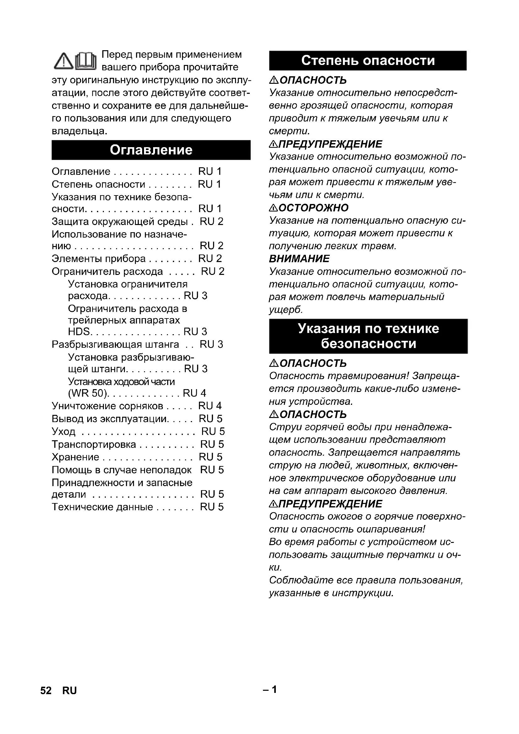 Оглавление . . . . . . . . . . . . . . RU 1 Степень опасности . . . . . . . . RU 1 Указания по технике безопа- сности. . . . . . . . . . . . . . . . . . . RU 1 Защита окружающей среды . RU 2 Использование по назначе- нию . . . . . . . . . . . . . . . . . . . . . RU 2 Элементы прибора . . . . . . . . RU 2 Ограничитель расхода . . . . . RU 2 Установка ограничителя расхода. . . . . . . . . . . . . RU 3 Ограничитель расхода в трейлерных аппаратах HDS. . . . . . . . . . . . . . . . RU 3 Разбрызгивающая штанга . . RU 3 Установка разбрызгиваю- щей штанги. . . . . . . . . . RU 3 Установка ходовой части (WR 50). . . . . . . . . . . . . RU 4 Уничтожение сорняков . . . . . RU 4 Вывод из эксплуатации. . . . . RU 5 Уход . . . . . . . . . . . . . . . . . . . . RU 5 Транспортировка . . . . . . . . . . RU 5 Хранение . . . . . . . . . . . . . . . . RU 5 Помощь в случае неполадок RU 5 Принадлежности и запасные детали . . . . . . . . . . . . . . . . . . RU 5 Технические данные . . . . . . . RU 5 Степень опасности Указания по технике безопасности 52 RU– 2 Упаковочные материалы пригодны для вторичной обработки. Поэтому не выбрасывайте упаковку вместе с до- машними отходами, а сдайте ее в один из пунктов приема вторичного сырья. Старые приборы содержат ценные перерабатываемые материалы, подлежащие передаче в пункты приемки вторичного сырья. Поэтому ути- лизируйте старые приборы через соот- ветствующие системы приемки отходов. Инструкции по применению компо- нентов (REACH) Актуальные сведения о компонентах приведены на веб-узле по следующему