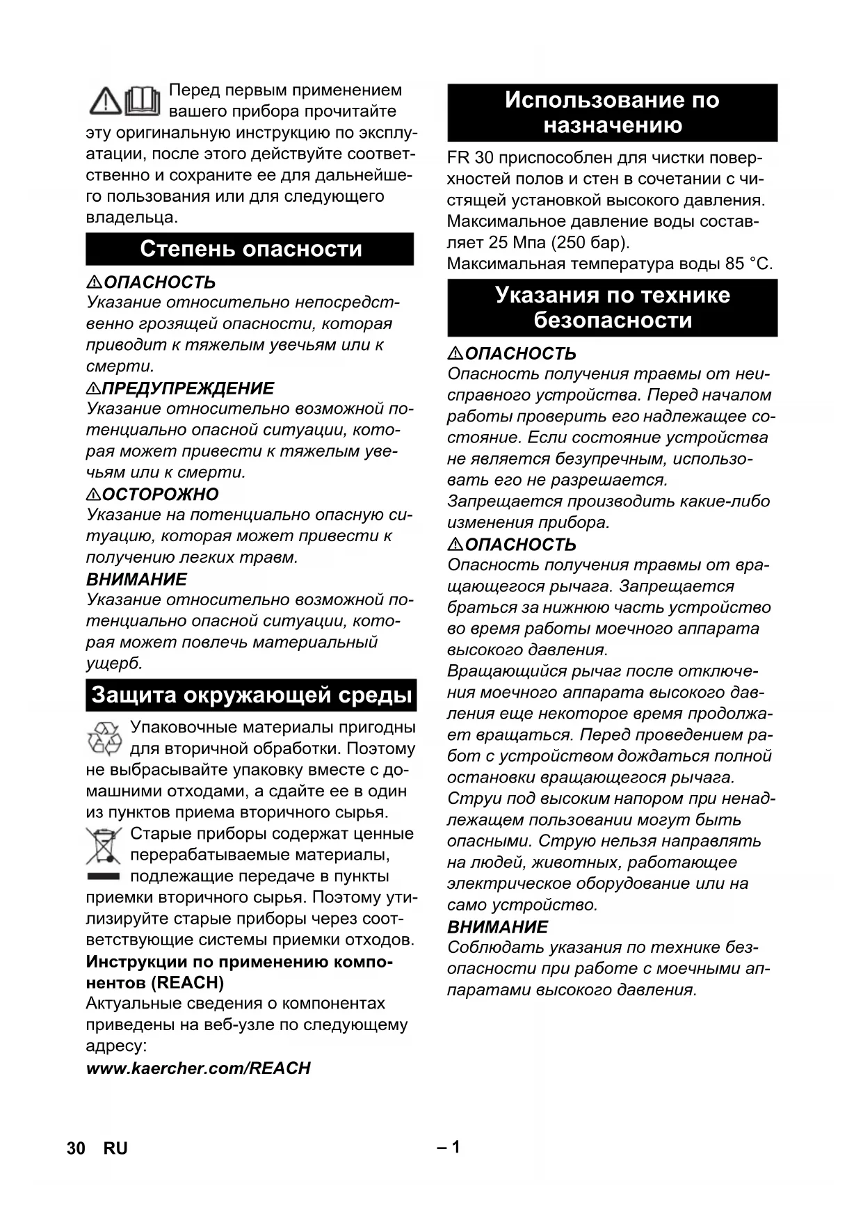 www.kaercher.com/REACH FR 30 приспособлен для чистки повер- хностей полов и стен в сочетании с чи- стящей установкой высокого давления. Максимальное давление воды состав- ляет 25 Mпа (250 бар). Максимальная температура воды 85 °C.