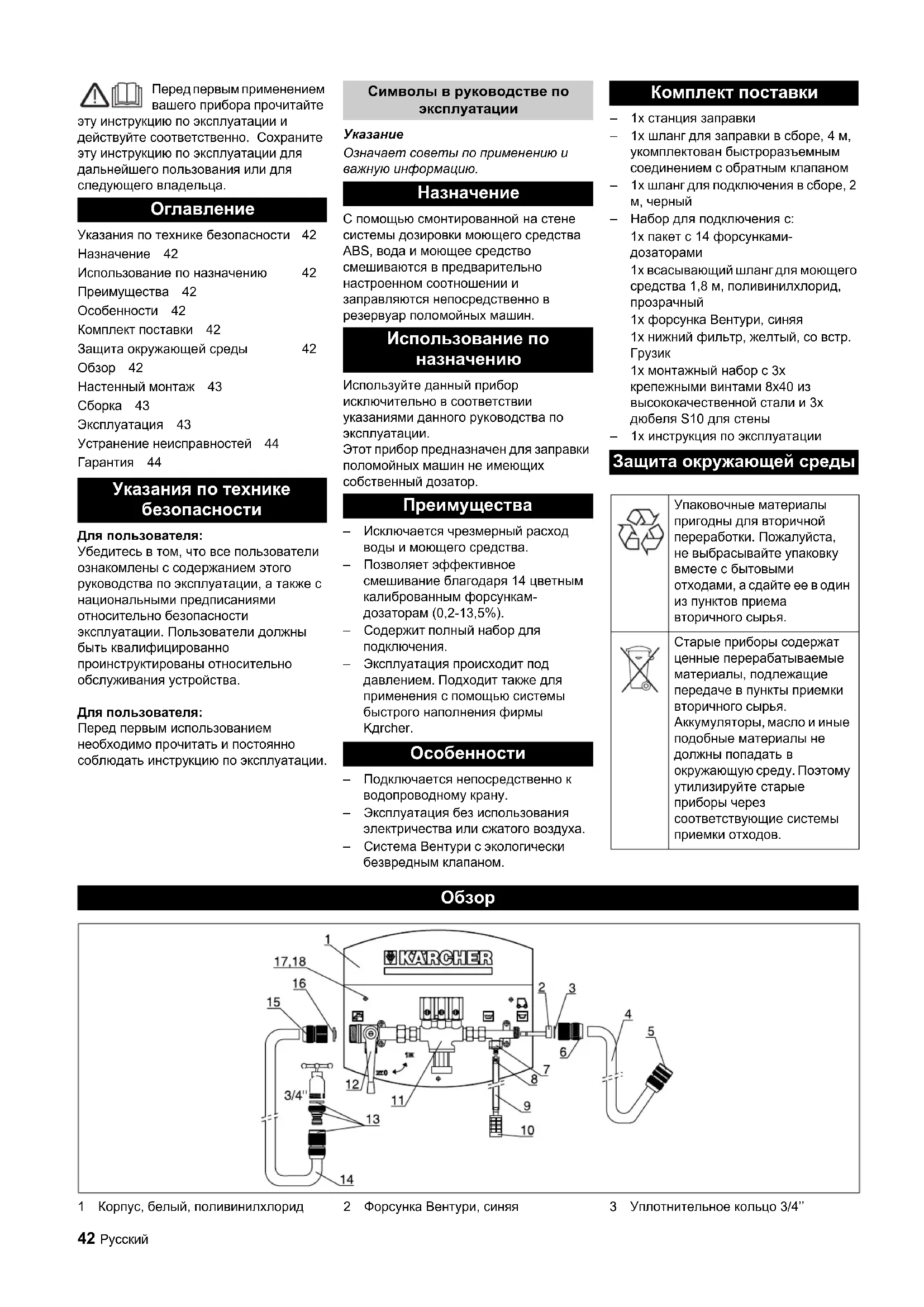 Означает советы по применению и важную информацию. C помощью смонтированной на стене системы дозировки моющего средства ABS, вода и моющее средство смешиваются в предварительно настроенном соотношении и заправляются непосредственно в резервуар поломойных машин. Используйте данный прибор исключительно в соответствии указаниями данного руководства по эксплуатации. Этот прибор предназначен для заправки поломойных машин не имеющих собственный дозатор. – Исключается чрезмерный расход воды и моющего средства. – Позволяет эффективное смешивание благодаря 14 цветным калиброванным форсункам- дозаторам (0,2-13,5%). – Содержит полный набор для подключения. – Эксплуатация происходит под давлением. Подходит также для применения с помощью системы быстрого наполнения фирмы Kдrcher. – Подключается непосредственно к водопроводному крану. – Эксплуатация без использования электричества или сжатого воздуха. – Система Вентури с экологически безвредным клапаном. –1x станция заправки –1x шланг для заправки в сборе, 4 м, укомплектован быстроразъемным соединением с обратным клапаном –1x шланг для подключения в сборе, 2
