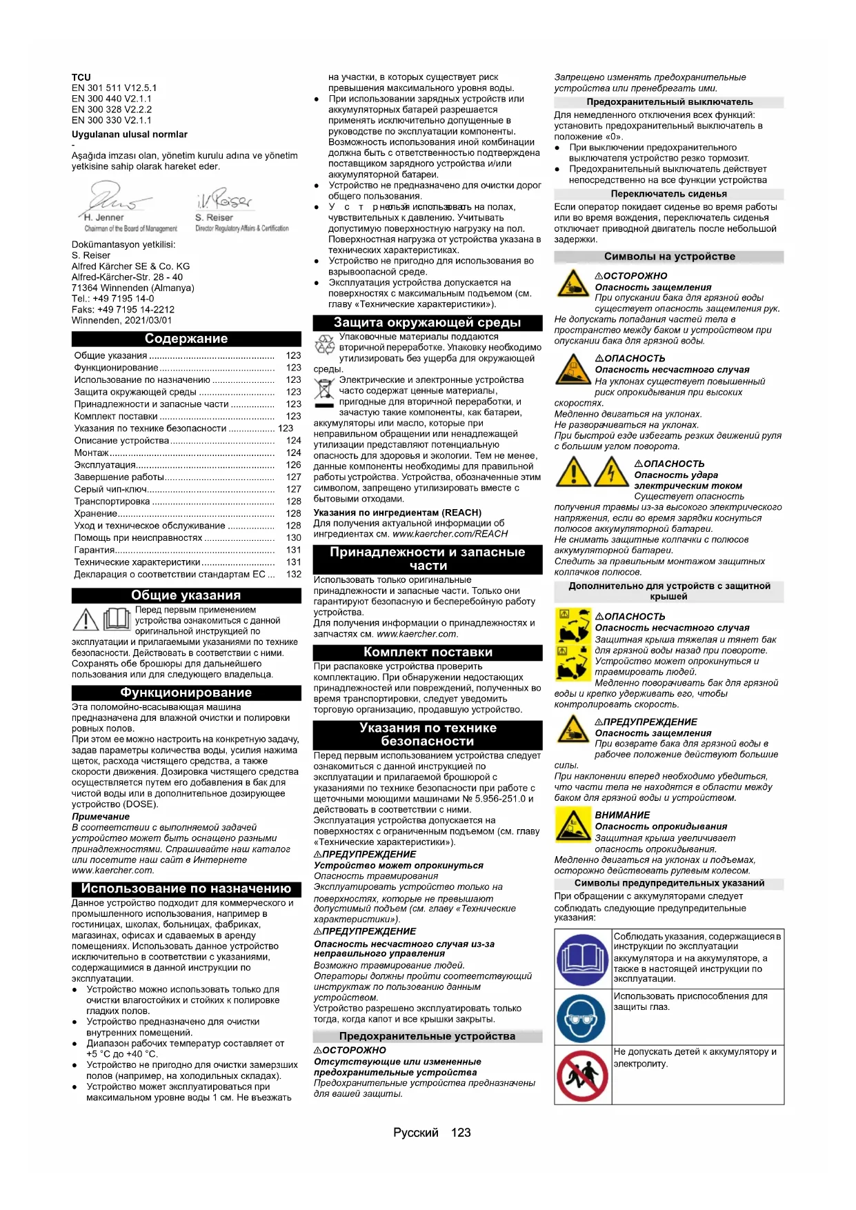 внутренних помещений. ●Диапазон рабочих температур составляет от +5 °C до +40 °C. ● Устройство не пригодно для очистки замерзших полов (например, на холодильных складах). ● Устройство может эксплуатироваться при максимальном уровне воды 1 см. Не въезжать на участки, в которых существует риск превышения максимального уровня воды. ●При использовании зарядных устройств или аккумуляторных батарей разрешается применять исключительно допущенные в руководстве по эксплуатации компоненты. Возможность использования иной комбинации должна быть с ответственностью подтверждена поставщиком зарядного устройства и/или аккумуляторной батареи. ●Устройство не предназначено для очистки дорог общего пользования. ●Устройство нельзя использовать на полах, чувствительных к давлению. Учитывать допустимую поверхностную нагрузку на пол. Поверхностная нагрузка от устройства указана в технических характеристиках. ●Устройство не пригодно для использования во взрывоопасной среде. ●Эксплуатация устройства допускается на поверхностях с максимальным подъемом (см. главу «Технические характеристики»). Защита окружающей среды Упаковочные материалы поддаются вторичной переработке. Упаковку необходимо утилизировать без ущерба для окружающей