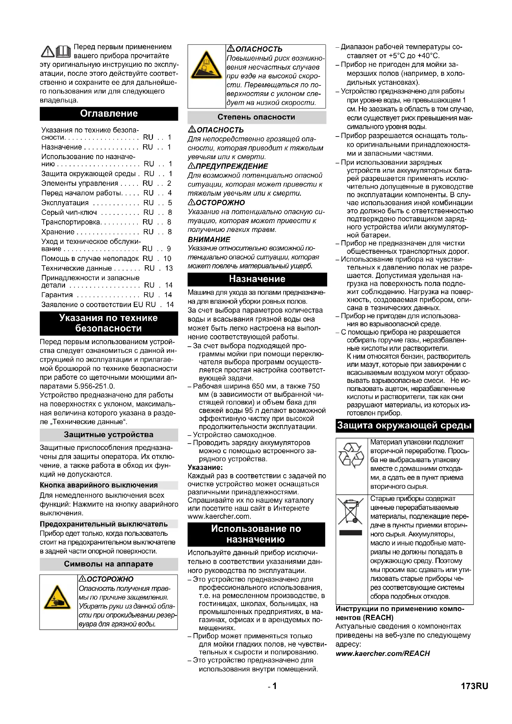 – Прибор может применяться только для мойки гладких полов, не чувстви- тельных к сырости и полированию. – Это устройство предназначено для использования внутри помещений. – Диапазон рабочей температуры со- ставляет от +5°C до +40°C. – Прибор не пригоден для мойки за- мерзших полов (например, в холо- дильных установках). – Устройство предназначено для работы при уровне воды, не превышающем 1 см. Не заезжать в область в том случае, если существует риск превышения мак- симального уровня воды. – Прибор разрешается оснащать толь- ко оригинальными принадлежностя- ми и запасными частями. – При использовании зарядных устройств или аккумуляторных бата- рей разрешается применять исклю- чительно допущенные в руководстве по эксплуатации компоненты. В слу- чае использования иной комбинации это должно быть с ответственностью подтверждено поставщиком заряд- ного устройства и/или аккумулятор- ной батареи. – Прибор не предназначен для чистки общественных транспортных дорог. – Использование прибора на чувстви- тельных к давлению полах не разре- шается. Допустимая удельная на- грузка на поверхность пола подле- жит соблюдению. Нагрузка на повер- хность, создоваемая прибором, опи- сана в тезнических данных. – Прибор не пригоден для использова- ния во взрывоопасной среде. – С помощью прибора не разрешается собирать горучие газы, неразбавлен- ные кислоты или растворители. К ним относятся бензин, растворитель или мазут, которые при завихрении с всасываемым воздухом могут образо- вывать взрывоопасные смеси. Не ис- пользовать ацетон, неразбавленные кислоты и растворители, так как они разрушают материалы, из которых из- готовлен прибор. Инструкции по применению компо- нентов (REACH) Актуальные сведения о компонентах приведены на веб-узле по следующему