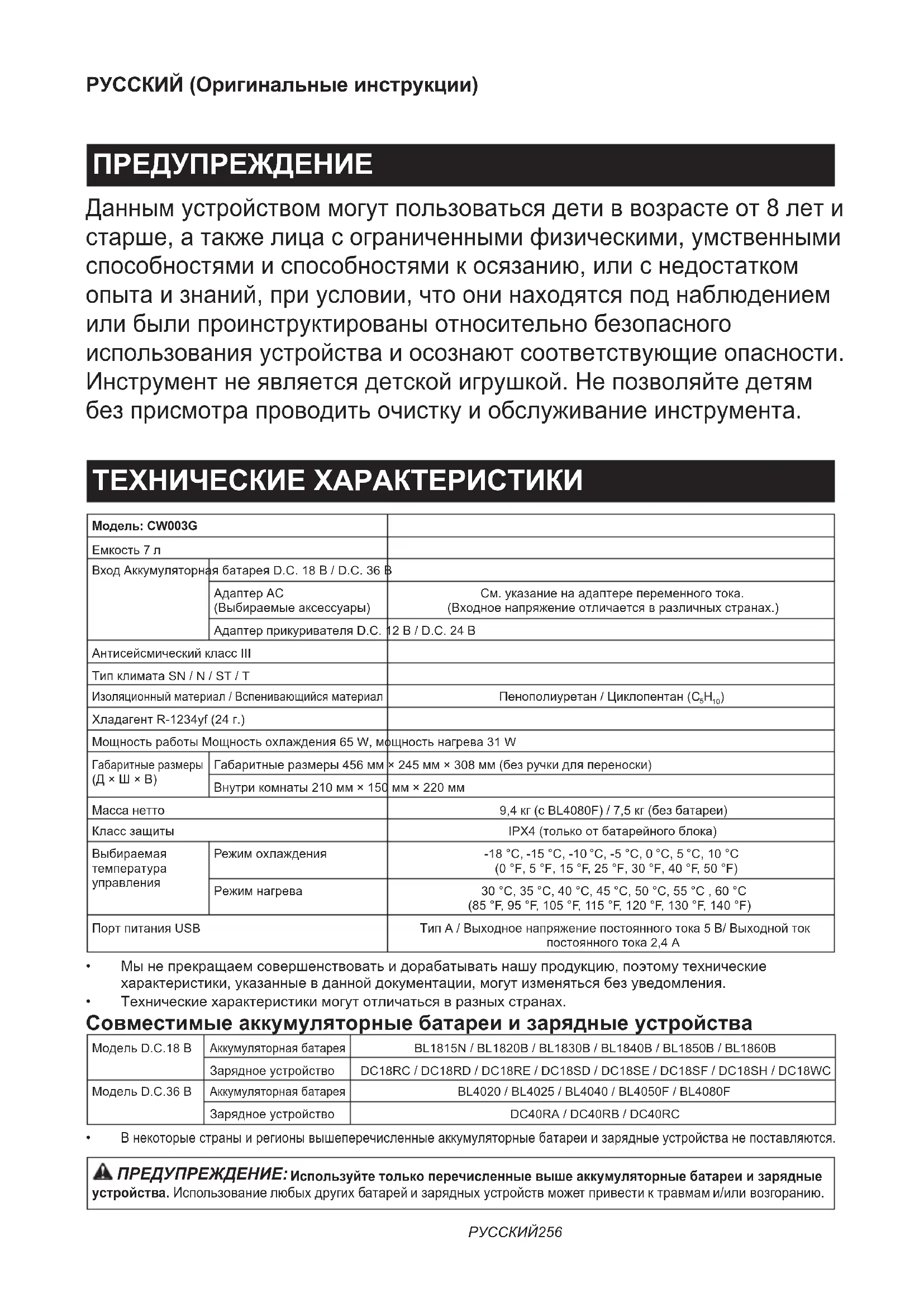 - Оригінальні батарея і зарядний пристрій Makita ПРИМІТКА: Деякі найменування зі списку можуть бути включені у пакування інструменту в якості стандартного приладдя. Вони можуть відрізнятися в залежності від країни.РУССКИЙ256 РУССКИЙ (Оригинальные инструкции) ПРЕДУПРЕЖДЕНИЕ Данным устройством могут пользоваться дети в возрасте от 8 лет и старше, а также лица с ограниченными физическими, умственными способностями и способностями к осязанию, или с недостатком опыта и знаний, при условии, что они находятся под наблюдением или были проинструктированы относительно безопасного использования устройства и осознают соответствующие опасности. Инструмент не является детской игрушкой. Не позволяйте детям без присмотра проводить очистку и обслуживание инструмента. ТЕХНИЧЕСКИЕ ХАРАКТЕРИСТИКИ Модель: CW003GЕмкость 7 лВход Аккумуляторная батарея D.C. 18 В / D.C. 36 ВАдаптер АС (Выбираемые аксессуары)См. указание на адаптере переменного тока. (Входное напряжение отличается в различных странах.)Адаптер прикуривателя D.C. 12 В / D.C. 24 ВАнтисейсмический класс IIIТип климата SN / N / ST / TИзоляционный материал / Вспенивающийся материалПенополиуретан / Циклопентан (C
