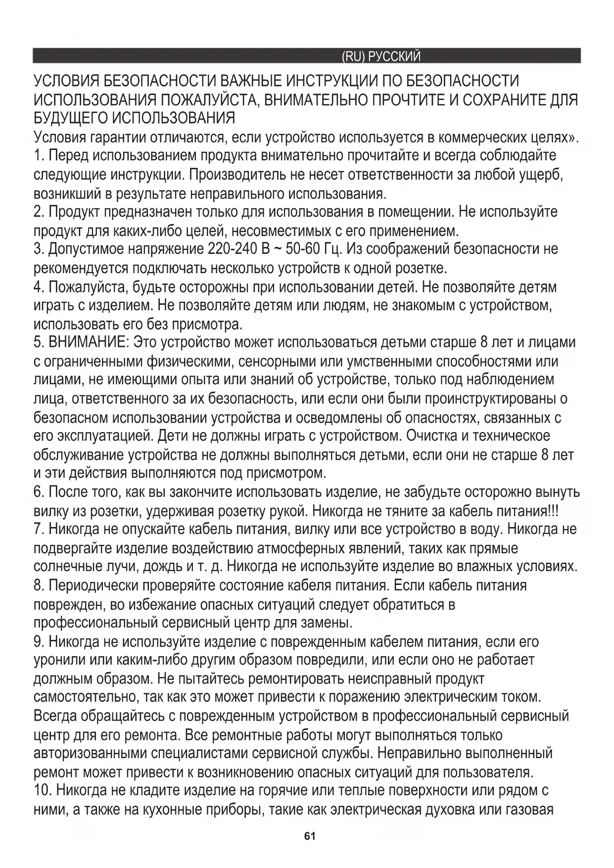 уронили или каким-либо другим образом повредили, или если оно не работает должным образом. Не пытайтесь ремонтировать неисправный продукт самостоятельно, так как это может привести к поражению электрическим током. Всегда обращайтесь с поврежденным устройством в профессиональный сервисный центр для его ремонта. Все ремонтные работы могут выполняться только авторизованными специалистами сервисной службы. Неправильно выполненный ремонт может привести к возникновению опасных ситуаций для пользователя. Условия гарантии отличаются, если устройство используется в коммерческих целях».
