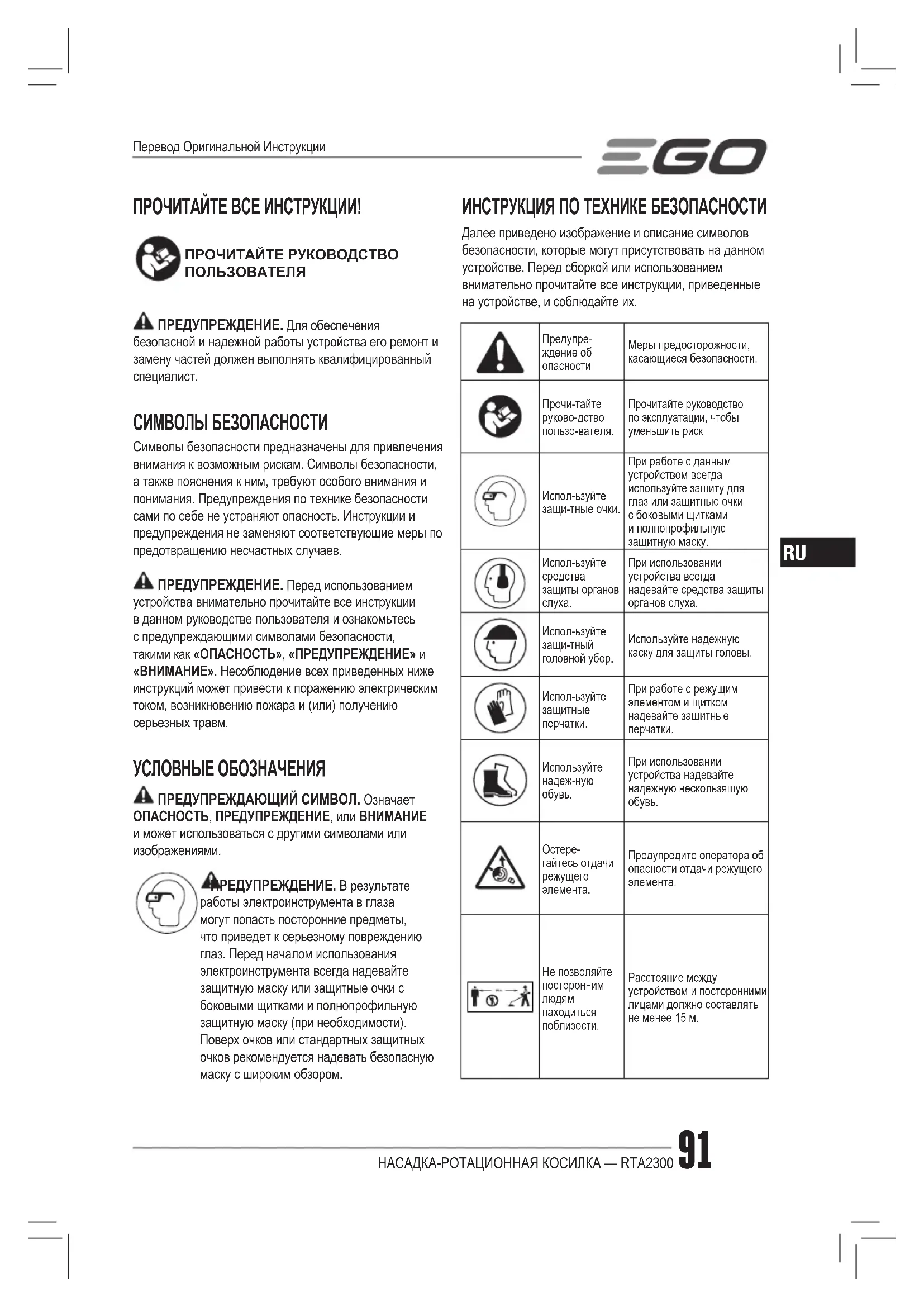 ПРОЧИТАЙТЕ ВСЕ ИНСТРУКЦИИ! ПРОЧИТАЙТЕ РУКОВОДСТВО ПОЛЬЗОВАТЕЛЯ ПРЕДУПРЕЖДЕНИЕ. Для обеспечения безопасной и надежной работы устройства его ремонт и замену частей должен выполнять квалифицированный специалист. СИМВОЛЫ БЕЗОПАСНОСТИ Символы безопасности предназначены для привлечения внимания к возможным рискам. Символы безопасности, а также пояснения к ним, требуют особого внимания и понимания. Предупреждения по технике безопасности сами по себе не устраняют опасность. Инструкции и предупреждения не заменяют соответствующие меры по предотвращению несчастных случаев. ПРЕДУПРЕЖДЕНИЕ. Перед использованием устройства внимательно прочитайте все инструкции в данном руководстве пользователя и ознакомьтесь с предупреждающими символами безопасности, такими как «ОПАСНОСТЬ», «ПРЕДУПРЕЖДЕНИЕ» и «ВНИМАНИЕ». Несоблюдение всех приведенных ниже инструкций может привести к поражению электрическим током, возникновению пожара и (или) получению серьезных травм. УСЛОВНЫЕ ОБОЗНАЧЕНИЯ ПРЕДУПРЕЖДАЮЩИЙ СИМВОЛ. Означает ОПАСНОСТЬ, ПРЕДУПРЕЖДЕНИЕ, или ВНИМАНИЕ и может использоваться с другими символами или изображениями. ПРЕДУПРЕЖДЕНИЕ. В результате работы электроинструмента в глаза могут попасть посторонние предметы, что приведет к серьезному повреждению глаз. Перед началом использования электроинструмента всегда надевайте защитную маску или защитные очки с боковыми щитками и полнопрофильную защитную маску (при необходимости). Поверх очков или стандартных защитных очков рекомендуется надевать безопасную маску с широким обзором. ИНСТРУКЦИЯ ПО ТЕХНИКЕ БЕЗОПАСНОСТИ Далее приведено изображение и описание символов безопасности, которые могут присутствовать на данном устройстве. Перед сборкой или использованием внимательно прочитайте все инструкции, приведенные на устройстве, и соблюдайте их. Предупре-ждение об опасностиМеры предосторожности, касающиеся безопасности.Прочи-тайте руково-дство пользо-вателя.Прочитайте руководство по эксплуатации, чтобы уменьшить риск Испол-ьзуйте защи-тные очки.При работе с данным устройством всегда используйте защиту для глаз или защитные очки с боковыми щитками и полнопрофильную защитную маску.Испол-ьзуйте средства защиты органов слуха.При использовании устройства всегда надевайте средства защиты органов слуха.Испол-ьзуйте защи-тный головной убор.Используйте надежную каску для защиты головы.Испол-ьзуйте защитные перчатки.При работе с режущим элементом и щитком надевайте защитные перчатки.Используйте надеж-ную обувь.При использовании устройства надевайте надежную нескользящую обувь.Остере-гайтесь отдачи режущего элемента.Предупредите оператора об опасности отдачи режущего элемента.Не позволяйте посторонним людям находиться поблизости.Расстояние между устройством и посторонними лицами должно составлять не менее 15 м. Перевод Оригинальной ИнструкцииНАСАДКА-РОТАЦИОННАЯ КОСИЛКА — RTA230092