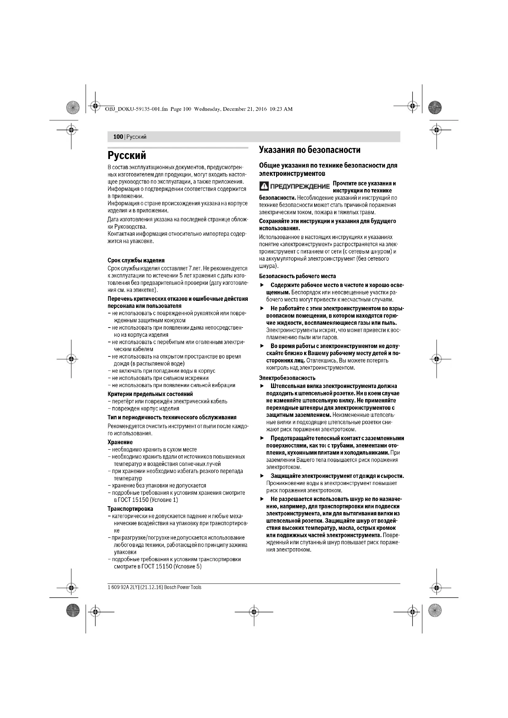 Безопасность рабочего места Содержите рабочее место в чистоте и хорошо осве- щенным. Беспорядок или неосвещенные участки ра- бочего места могут привести к несчастным случаям. Не работайте с этим электроинструментом во взры- воопасном помещении, в котором находятся горю- чие жидкости, воспламеняющиеся газы или пыль. Электроинструменты искрят, что может привести к вос- пламенению пыли или паров. Во время работы с электроинструментом не допу- скайте близко к Вашему рабочему месту детей и по- сторонних лиц. Отвлекшись, Вы можете потерять контроль над электроинструментом. Электробезопасность Штепсельная вилка электроинструмента должна подходить к штепсельной розетке. Ни в коем случае не изменяйте штепсельную вилку. Не применяйте переходные штекеры для электроинструментов с защитным заземлением. Неизмененные штепсель- ные вилки и подходящие штепсельные розетки сни- жают риск поражения электротоком. Предотвращайте телесный контакт с заземленными поверхностями, как то: с трубами, элементами ото- пления, кухонными плитами и холодильниками. При заземлении Вашего тела повышается риск поражения электротоком. Защищайте электроинструмент от дождя и сырости. Проникновение воды в электроинструмент повышает риск поражения электротоком. Не разрешается использовать шнур не по назначе- нию, например, для транспортировки или подвески электроинструмента, или для вытягивания вилки из штепсельной розетки. Защищайте шнур от воздей- ствия высоких температур, масла, острых кромок или подвижных частей электроинструмента. Повре- жденный или спутанный шнур повышает риск пораже- ния электротоком. OBJ_DOKU-59135-001.fm Page 100 Wednesday, December 21, 2016 10:23 AMРусский | 101 Bosch Power Tools 1 609 92A 2LY | (19.12.16) При работе с электроинструментом под открытым небом применяйте пригодные для этого кабели-уд- линители. Применение пригодного для работы под от- крытым небом кабеля-удлинителя снижает риск пора- жения электротоком. Если невозможно избежать применения электроин- струмента в сыром помещении, подключайте элек- троинструмент через устройство защитного отклю- чения. Применение устройства защитного отключения снижает риск электрического поражения. Безопасность людей Будьте внимательными, следите за тем, что Вы делаете, и продуманно начинайте работу с электро- инструментом. Не пользуйтесь электроинструмен- том в усталом состоянии или если Вы находитесь в состоянии наркотического или алкогольного опья- нения или под воздействием лекарств. Один момент невнимательности при работе с электроинструментом может привести к серьезным травмам. Применяйте средства индивидуальной защиты и всегда защитные очки. Использование средств инди- видуальной защиты, как то: защитной маски, обуви на нескользящей подошве, защитного шлема или средств защиты органов слуха, – в зависимости от вида работы с электроинструментом снижает риск получения