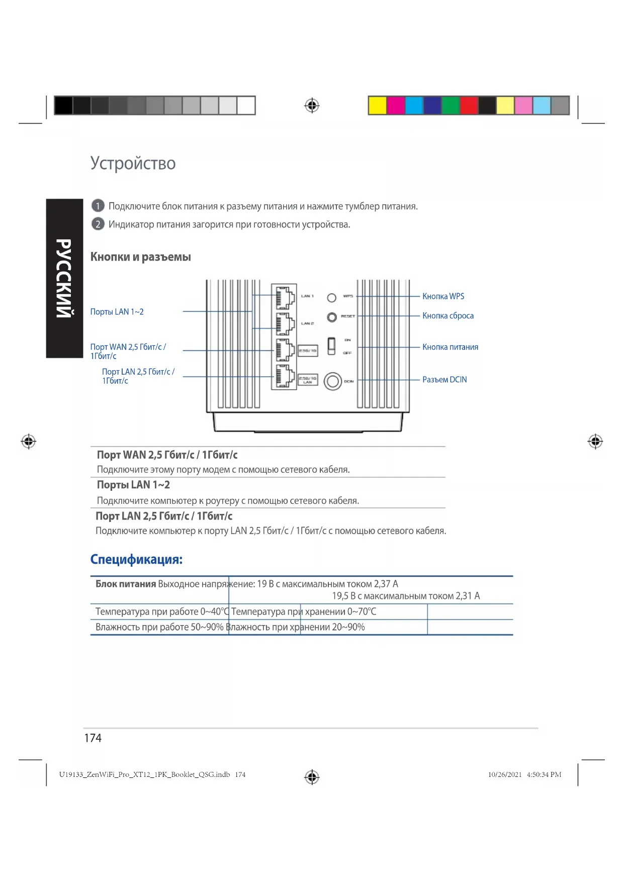 Подключите блок питания к разъему питания и нажмите тумблер питания. Индикатор питания загорится при готовности устройства. Кнопки и разъемы Порт WAN 2,5 Гбит/с / 1Гбит/с Подключите этому порту модем с помощью сетевого кабеля. Порты LAN 1~2 Подключите компьютер к роутеру с помощью сетевого кабеля.Блок питания Выходное напряжение: 19 В с максимальным током 2,37 A 19,5 В с максимальным током 2,31 AТемпература при работе 0~40°C Температура при хранении 0~70°CВлажность при работе 50~90% Влажность при хранении 20~90% Спецификация: Порты LAN 1~2Кнопка WPSКнопка сбросаКнопка питанияРазъем DCIN Порт LAN 2,5 Гбит/с / 1Гбит/с Подключите компьютер к порту LAN 2,5 Гбит/с / 1Гбит/с c помощью сетевого кабеля.Порт WAN 2,5 Гбит/с / 1Гбит/сПорт LAN 2,5 Гбит/с / 1Гбит/с U19133_ZenWiFi_Pro_XT12_1PK_Booklet_QSG.indb 174U19133_ZenWiFi_Pro_XT12_1PK_Booklet_QSG.indb 174 10/26/2021 4:50:34 PM10/26/2021 4:50:34 PM175