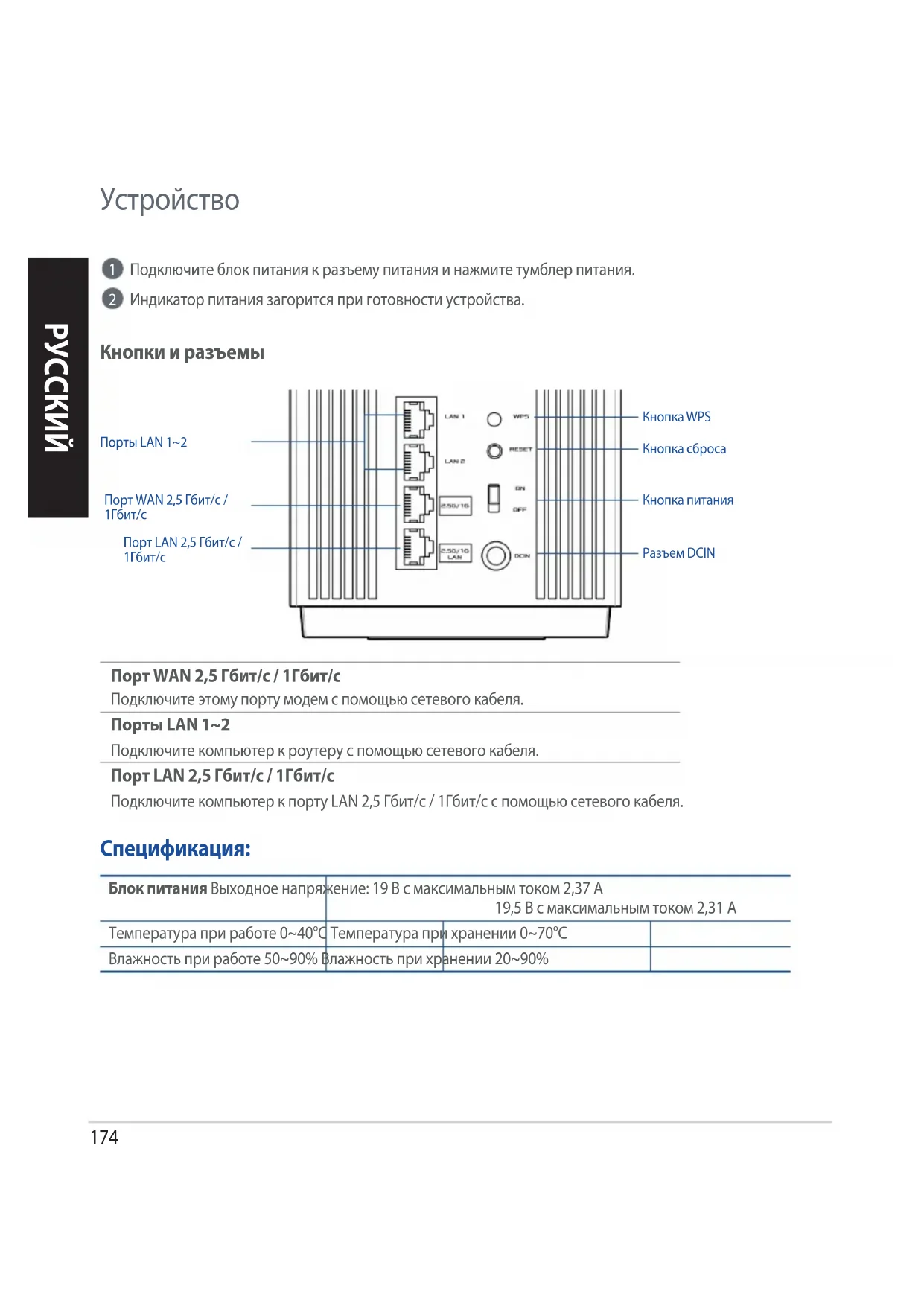 Подключите блок питания к разъему питания и нажмите тумблер питания. Индикатор питания загорится при готовности устройства. Кнопки и разъемы Порт WAN 2,5 Гбит/с / 1Гбит/с Подключите этому порту модем с помощью сетевого кабеля. Порты LAN 1~2 Подключите компьютер к роутеру с помощью сетевого кабеля.Блок питания Выходное напряжение: 19 В с максимальным током 2,37 A 19,5 В с максимальным током 2,31 AТемпература при работе 0~40°C Температура при хранении 0~70°CВлажность при работе 50~90% Влажность при хранении 20~90% Спецификация: Порты LAN 1~2Кнопка WPSКнопка сбросаКнопка питанияРазъем DCIN Порт LAN 2,5 Гбит/с / 1Гбит/с Подключите компьютер к порту LAN 2,5 Гбит/с / 1Гбит/с c помощью сетевого кабеля.Порт WAN 2,5 Гбит/с / 1Гбит/сПорт LAN 2,5 Гбит/с / 1Гбит/с175