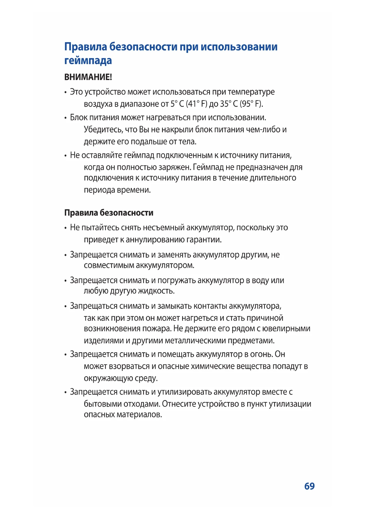 - Не оставляйте геймпад подключенным к источнику питания, когда он полностью заряжен. Геймпад не предназначен для подключения к источнику питания в течение длительного периода времени. Правила безопасности