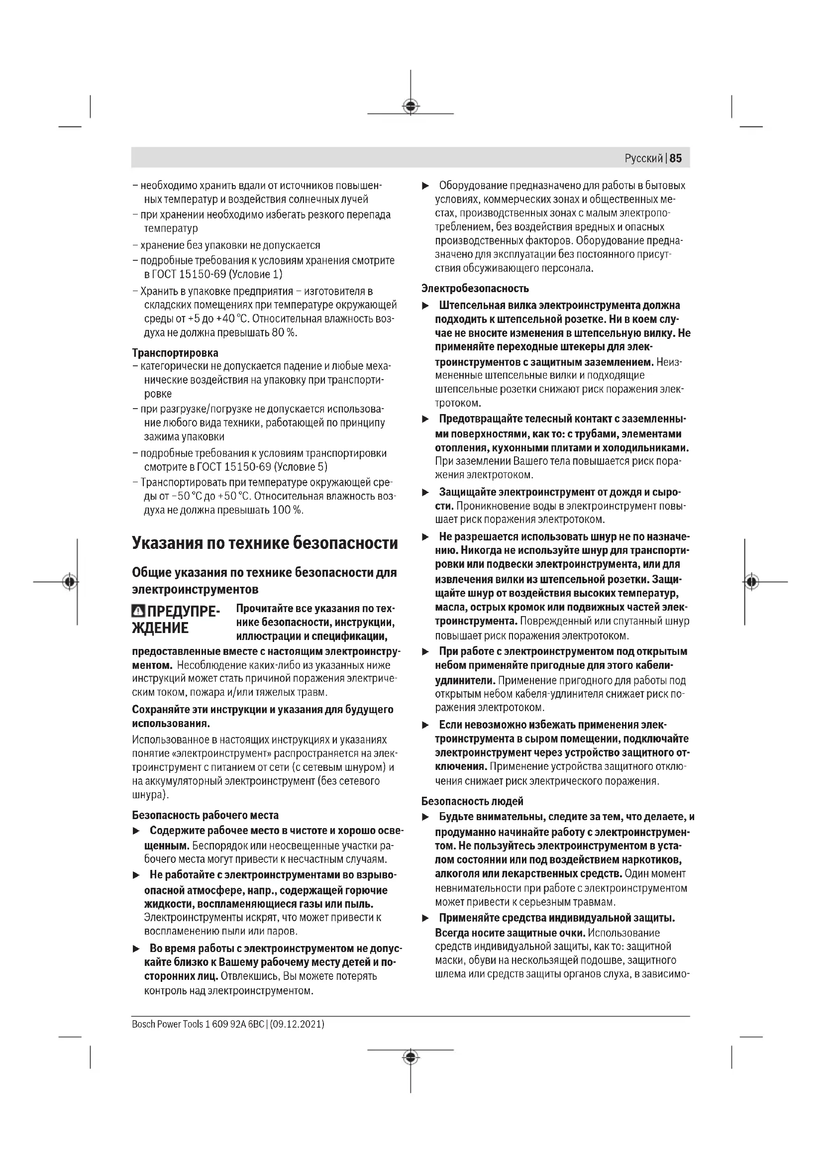 – необходимо хранить в сухом месте 1 609 92A 6BC | (09.12.2021) Bosch Power ToolsРусский | 85 – необходимо хранить вдали от источников повышен- ных температур и воздействия солнечных лучей – при хранении необходимо избегать резкого перепада