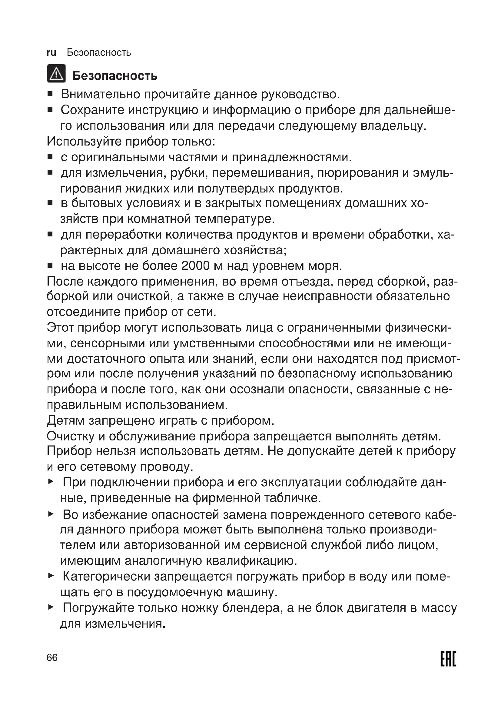 Безопасность ¡ Внимательно прочитайте данное руководство. ¡ Сохраните инструкцию и информацию о приборе для дальнейше- го использования или для передачи следующему владельцу. Используйте прибор только: ¡ с оригинальными частями и принадлежностями. ¡ для измельчения, рубки, перемешивания, пюрирования и эмуль- гирования жидких или полутвердых продуктов. ¡ в бытовых условиях и в закрытых помещениях домашних хо- зяйств при комнатной температуре. ¡ для переработки количества продуктов и времени обработки, ха- рактерных для домашнего хозяйства; ¡ на высоте не более 2000м над уровнем моря. После каждого применения, во время отъезда, перед сборкой, раз- боркой или очисткой, а также в случае неисправности обязательно отсоедините прибор от сети. Этот прибор могут использовать лица с ограниченными физически- ми, сенсорными или умственными способностями или не имеющи- ми достаточного опыта или знаний, если они находятся под присмот- ром или после получения указаний по безопасному использованию прибора и после того, как они осознали опасности, связанные с не- правильным использованием. Детям запрещено играть с прибором. Очистку и обслуживание прибора запрещается выполнять детям. Прибор нельзя использовать детям. Не допускайте детей к прибору и его сетевому проводу. ▶ При подключении прибора и его эксплуатации соблюдайте дан- ные, приведенные на фирменной табличке. ▶ Во избежание опасностей замена поврежденного сетевого кабе- ля данного прибора может быть выполнена только производи- телем или авторизованной им сервисной службой либо лицом, имеющим аналогичную квалификацию. ▶ Категорически запрещается погружать прибор в воду или поме- щать его в посудомоечную машину. ▶ Погружайте только ножку блендера, а не блок двигателя в массу для измельчения.Предотвращение материального ущерба ru
