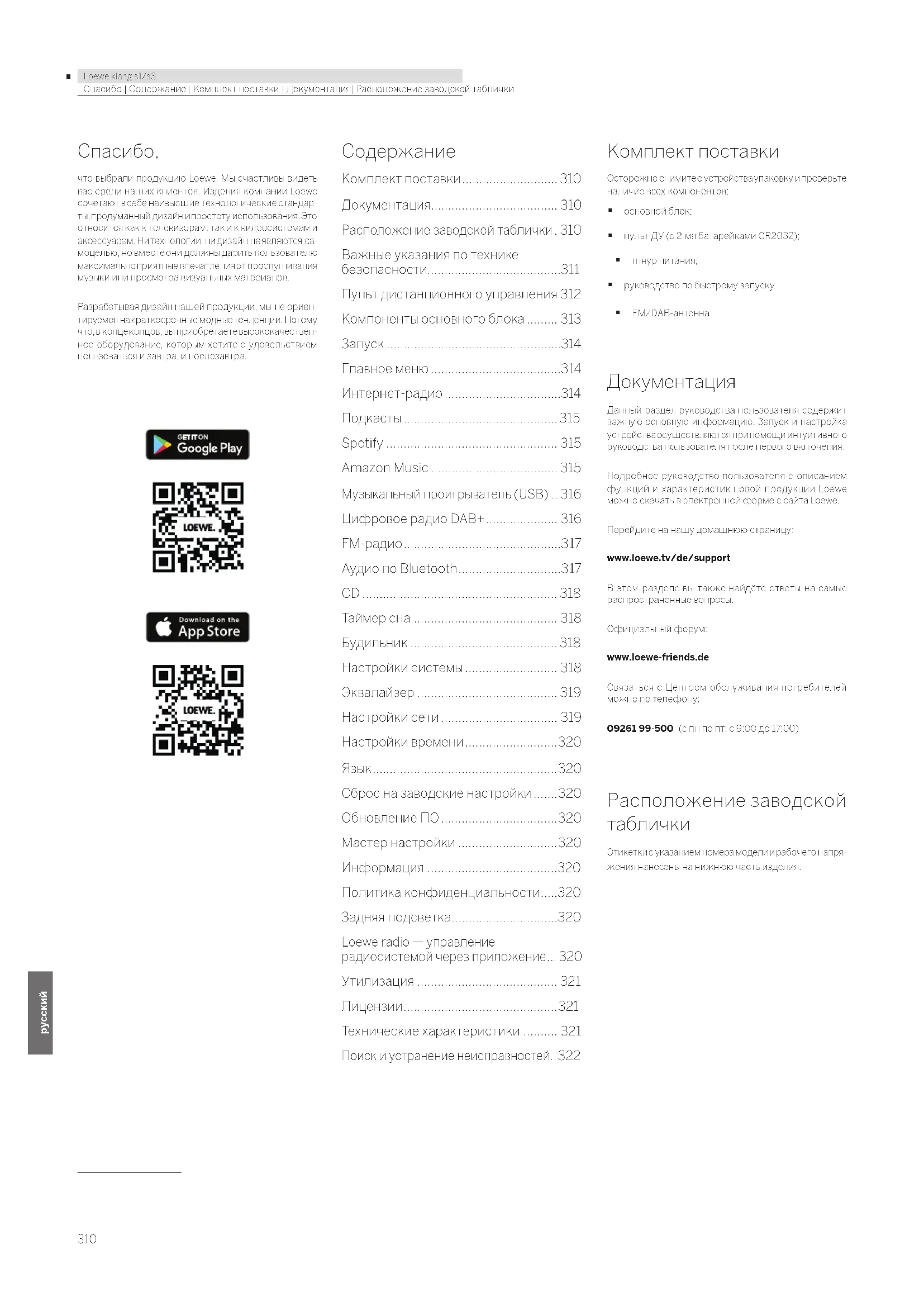 Комплект поставки Осторожно снимите с устройства упаковку и проверьте наличие всех компонентов: основной блок; пульт ДУ (с 2-мя батарейками CR2032); шнур питания; руководство по быстрому запуску. FM/DAB-антенна Документация Данный раздел руководства пользователя содержит важную основную информацию. Запуск и настройка устройства осуществляются при помощи интуитивного руководства пользователя после первого включения. Подробное руководство пользователя с описанием функций и характеристик новой продукции Loewe можно скачать в электронной форме с сайта Loewe. Перейдите на нашу домашнюю страницу: www.loewe.tv/de/support В этом разделе вы также найдёте ответы на самые распространённые вопросы.Официальный форум:www.loewe-friends.de Связаться с Центром обслуживания потребителей можно по телефону: 09261 99-500 (с пн по пт: с 9:00 до 17:00) Расположение заводской