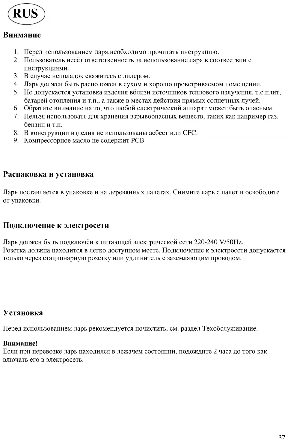 RUS Содержание Внимание 37 Распаковка и установка 37 Подключение к электросети 37 Запуск 37 Контрольная панель 38 Размораживание 38 Техобслуживание 39 Устранение неполадок 39 Утилизация 395