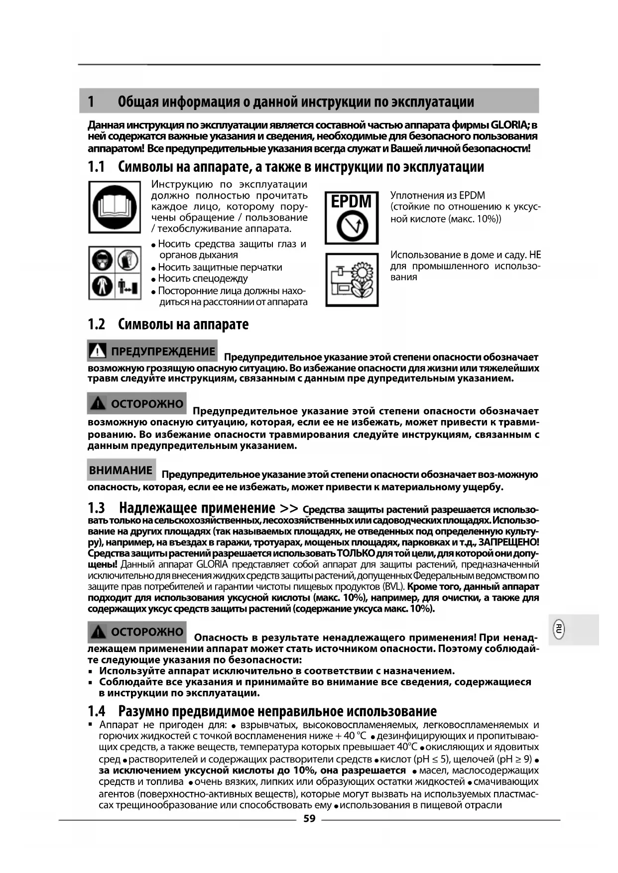вать только на сельскохозяйственных, лесохозяйственных или садоводческих площадях. Использо- вание на других площадях (так называемых площадях, не отведенных под определенную культу- ру), например, на въездах в гаражи, тротуарах, мощеных площадях, парковках и т.д., ЗАПРЕЩЕНО! Средства защиты растений разрешается использовать ТОЛЬКО для той цели, для которой они допу- щены! Данный аппарат GLORIA представляет собой аппарат для защиты растений, предназначенный исключительно для внесения жидких средств защиты растений, допущенных Федеральным ведомством по защите прав потребителей и гарантии чистоты пищевых продуктов (BVL). Кроме того, данный аппарат подходит для использования уксусной кислоты (макс. 10%), например, для очистки, а также для содержащих уксус средств защиты растений (содержание уксуса макс. 10%).